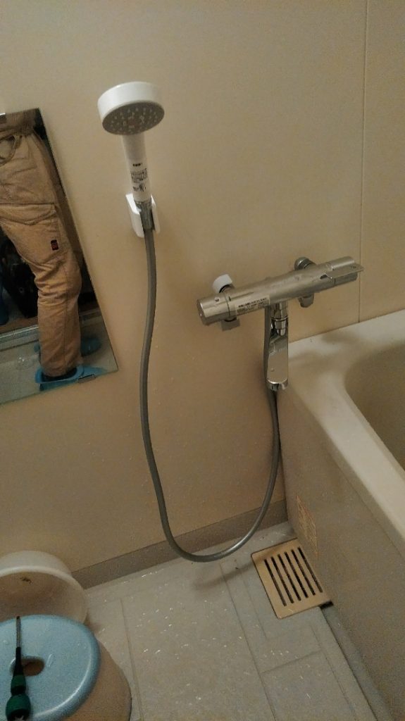 今日はお客様が浴室の蛇口を購入されて自分で交換は自信が無いという事で取付の依頼で行ってきました。拝見すると既存の蛇口はお湯と水のハンドルが2つある古いタイプの蛇口で新しいのはサーモスタット付きのワンレバーの蛇口です。古いのを外して新しい蛇口に交換し使いやすそうとお客様は喜ばれていました。(^O^)/
