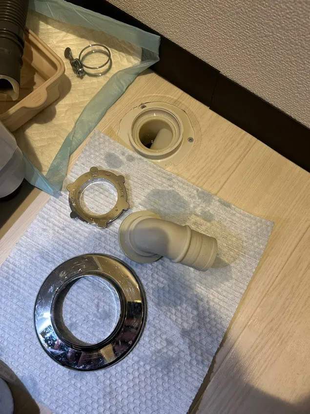 札幌市豊平区中の島にお住まいのお客様より、台所の水漏れ修理のご依頼をいただきました。台所を使用するとシンク下の床から水が漏れてくるとのことで調査を実施。確認したところ、排水管の劣化により接続部から漏水している状態でした。
