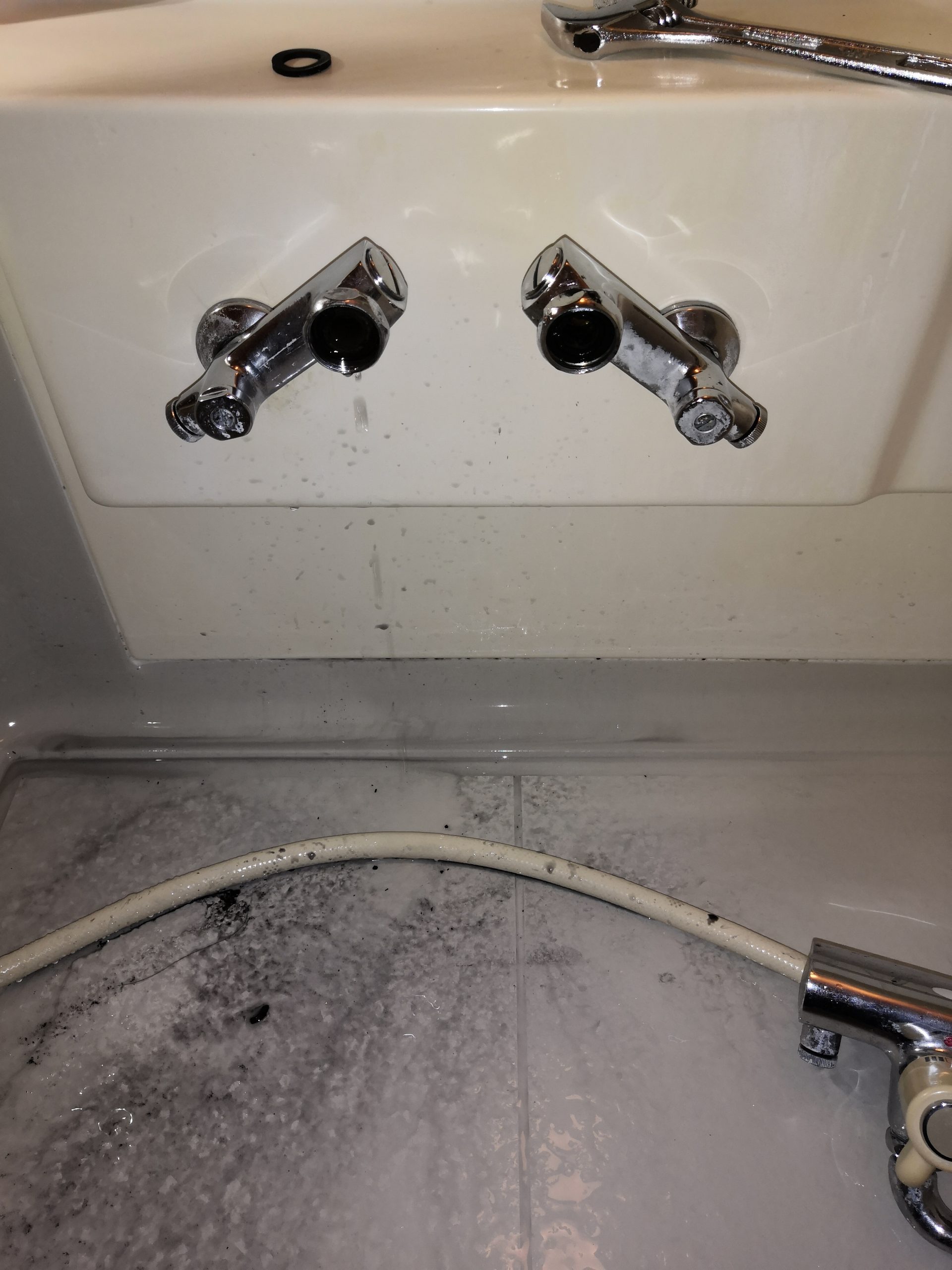 パッキンを見てみようとナットを緩めたら、黒いお湯がでてきて、パッキンが粉々になっていました。。。。