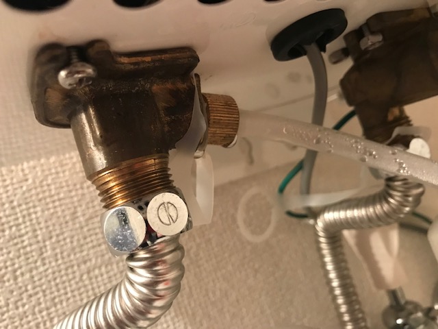 早速調査してみるとボイラー内の水を抜くために付いている接続部から水漏れしていました。