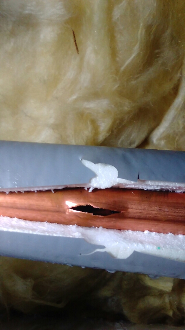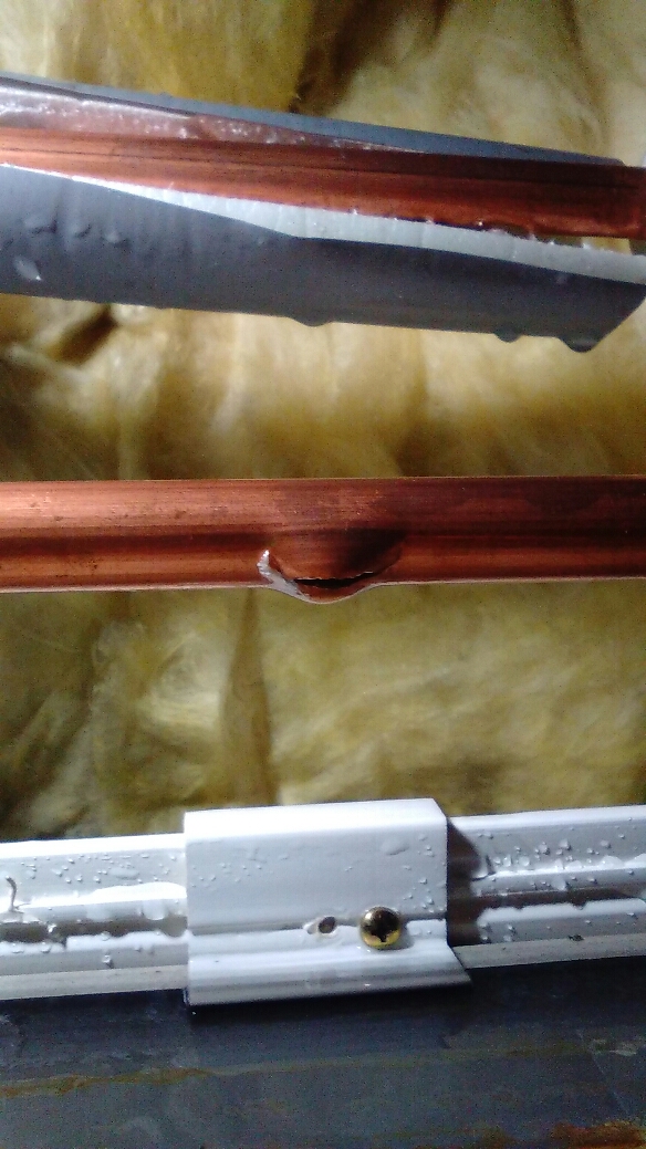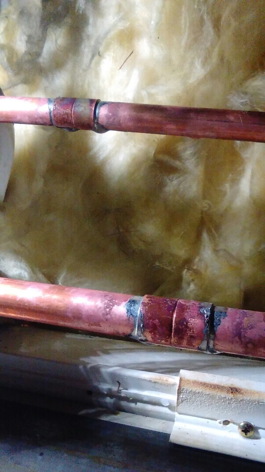今日は浴室の天井から水が漏れてきて困ってるので何とかしてほしいとの依頼で行ってきました。拝見すると浴室が雨漏りしているようでした。点検口をあけて管をみると管が破裂していました。昨日の冷え込みにもかかわらず、水落としをしていなかったので管が膨張して破裂していました。2か所、破裂していて銅管なので切ってソケットで繋げてハンダで溶接して終了です。まだ浴室だったので良かったですが居間や部屋の天井でしたら大変なことなのでご注意ください!!!!