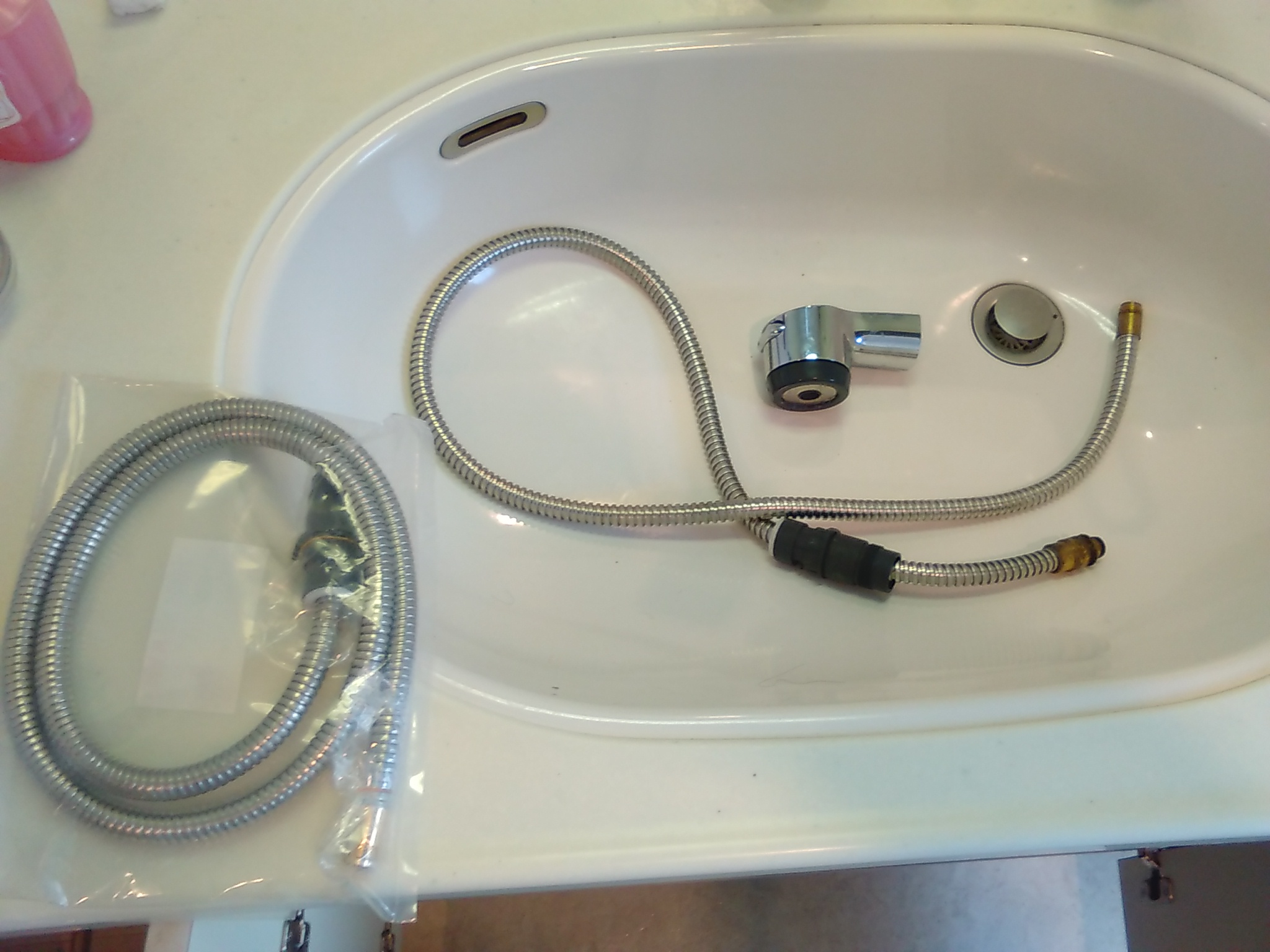 本日は、洗面台水栓の水漏れとの出動依頼がありお伺いしました。シャワータイプの水栓でシャワーホースの経年劣化で水漏れしたようです。MYMというメーカー製なのですが、こちらのメーカーは現在営業されていません。部品供給等は現在KVKというメーカーが受付をしていますので確認したところ、まだ供給がある部品でした。無事にシャワーホースを交換して完了しました。MYM製品に関しては、部品供給が終了している製品もあるため、故障した際は本体ごと交換も覚悟した方がいいかもしれません(´Д`)