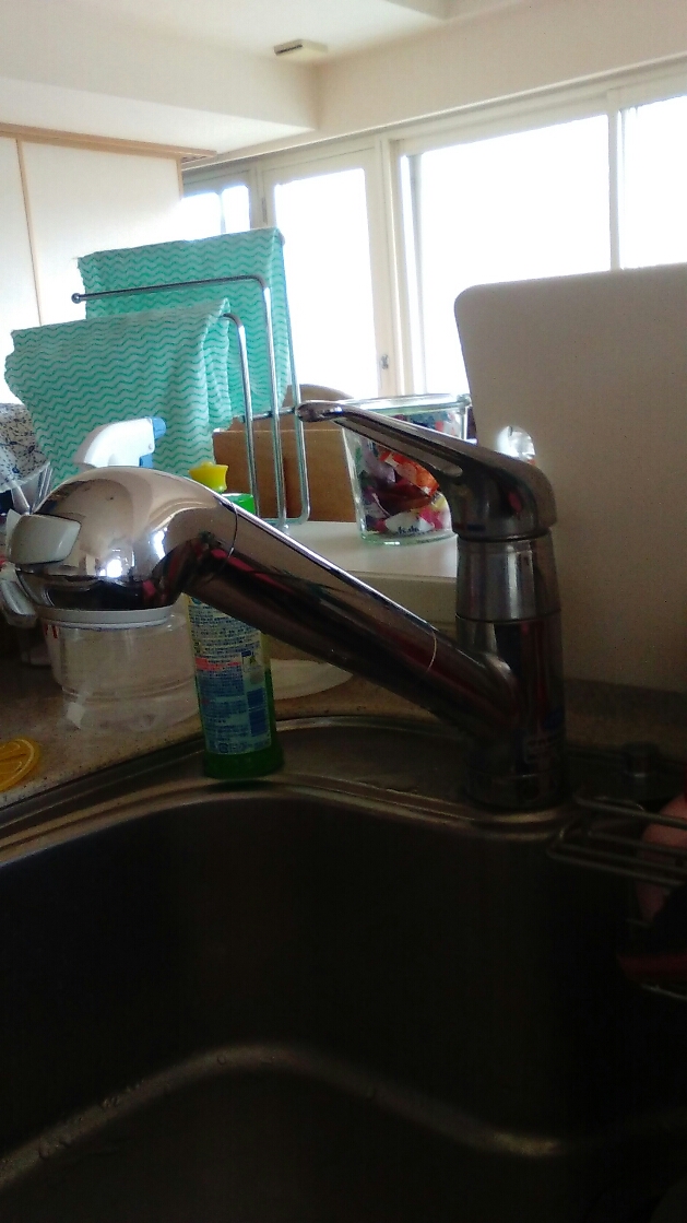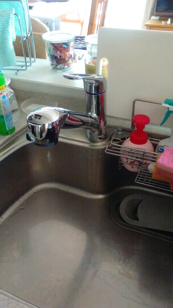 今日は提携会社からの依頼で台所のシンクが濡れているので見て欲しいとの依頼で行ってきました。拝見すると台所の蛇口がシャワーヘッドになっていて、そのホースから水が漏れている状態です。ホースの中がゴムになっていて経年劣化でゴムが裂けて水が漏れている状態です。本来ならホースだけの交換でいいのですが部品をメーカーに注文してお日にちを頂く話をして今手持ちのタカギ製の蛇口一体型浄水器のシャワータイプならすぐ交換出来る話をすると直ぐ交換してという事で交換になりました。