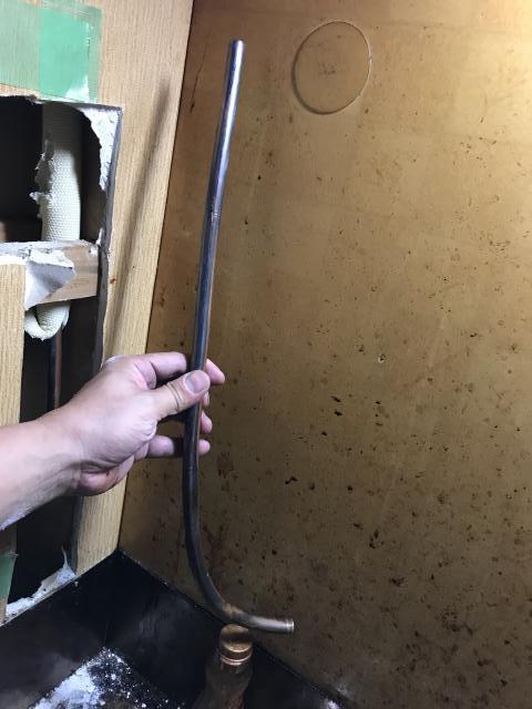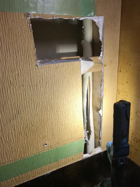 壁を開口すると配管からの水漏れを発見したので、ピンホールしている部分を切り取って新しい管に交換しました。