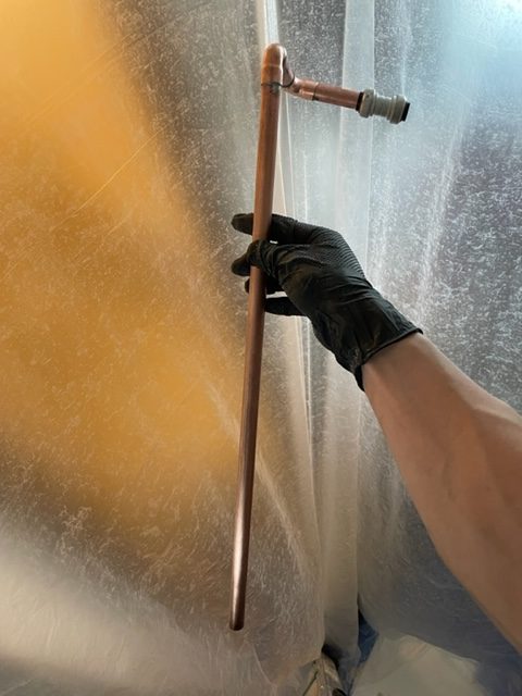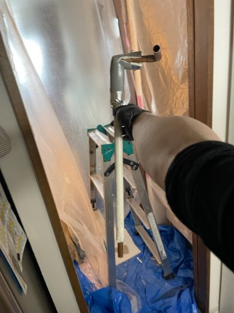 天井から壁に伸びている配管の一部がピンホールしていたようで、こちらを新しい配管に交換しました。