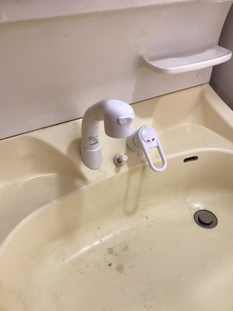 今日は洗面台の蛇口のレバーの根元からの漏水とレバー動作が固いので見て欲しいとの依頼で行ってきました。話を聞くとかれこれ18年使用していて、しかももうないメーカーの水栓蛇口でした。その旨をお客様に話し水栓自体の交換にまりました。斜め45度の施工の珍しい蛇口でした。
