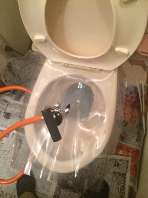 本日は、昨日から、トイレが詰まったと、お電話頂きました。使用状況や詰まりの状況を確認して、簡易除去では難しい詰まりのようでしたので、今回は、高圧ポンプでの作業を致しました。1回、2回と高圧をかけたのですが状況が変わりません。ダメもとで、もう一回、高圧をかけると、やっと詰まりが除去できました(^^♪ 今回は、手強い感じでした。これでダメなら、便器を外すしかなく、詰まりが抜けて良かったです。(^^)/