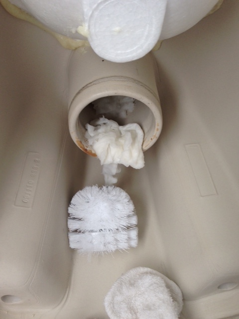 便器を外して下から覗いてみると、おっしゃっていた通りに掃除用具の一部分がひょっこり出てきました。