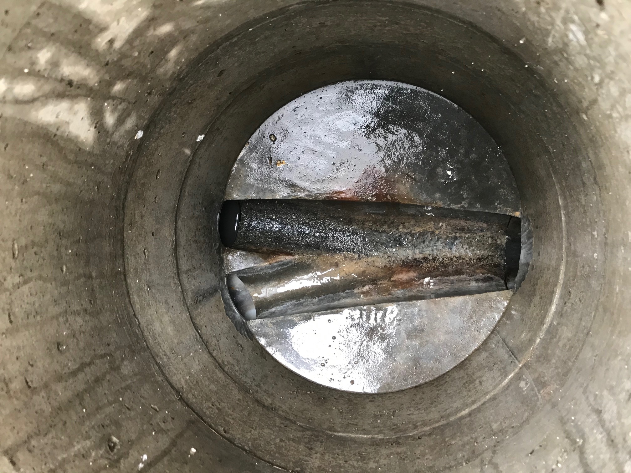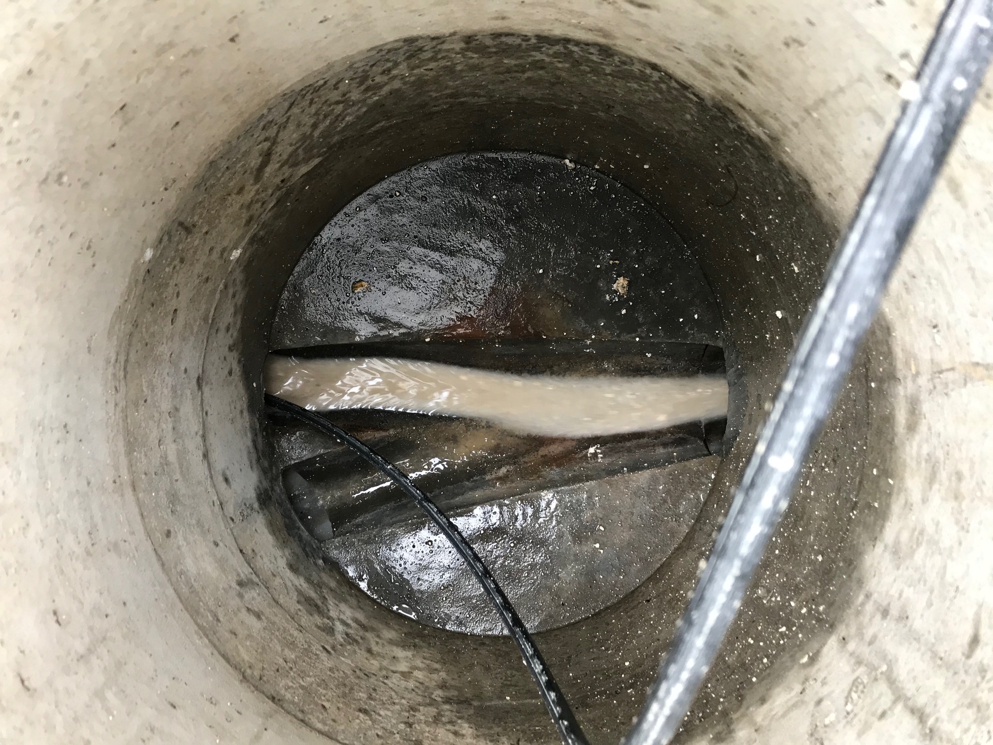 このマンホールから高圧洗浄機を使用すると排水管の奥のほうから汚れや油が凝固しら塊が出てきました。