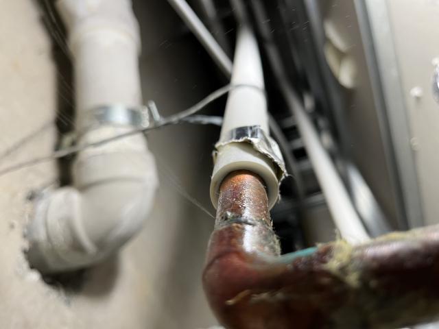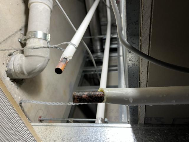 経年劣化によるピンホールを起こしており、こちらの銅管を一旦切り落として再度接続して改善しました。