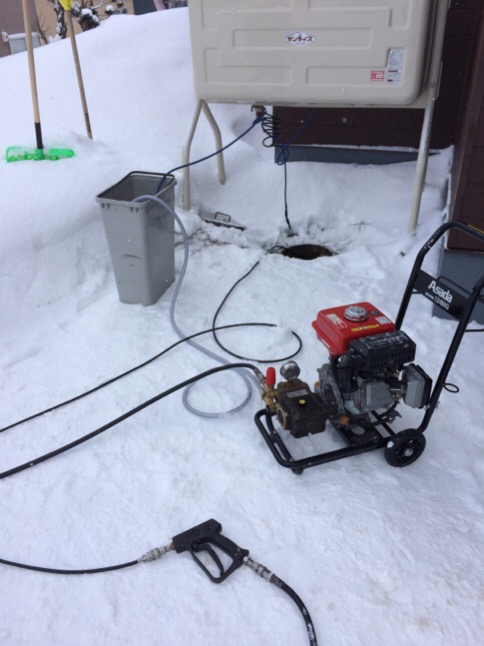 本日は、何日前からトイレの流れが悪いと入電。早速急行し点検すると外の排水管での詰まりでした。早速、お客様に原因を話て、修理内容を伝えて、ご了承いただき作業に入りました。(^^)/ 高圧洗浄機を使用し詰まりの改善を行いました。これで、安心してトイレを使用できますね(^^♪ この頃、凍結が多かったので、別の修理でしたので新鮮でした。でも、寒かった~”(-“”-)”