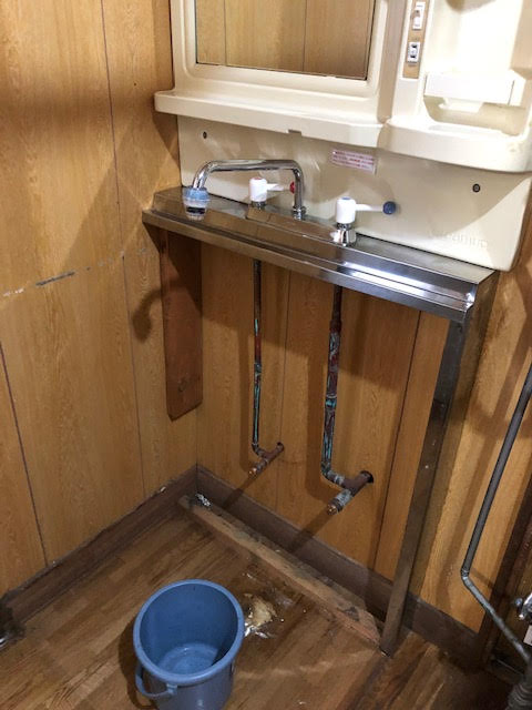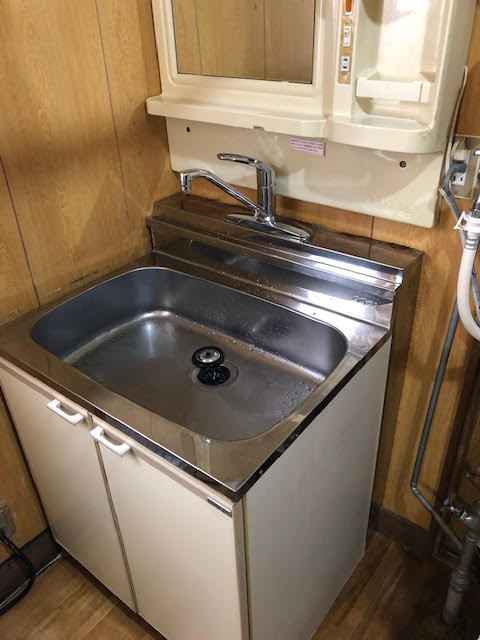 写真で見ると、ミラーとセットになっている台ではなく、小規模の台所シンクが付いていますが