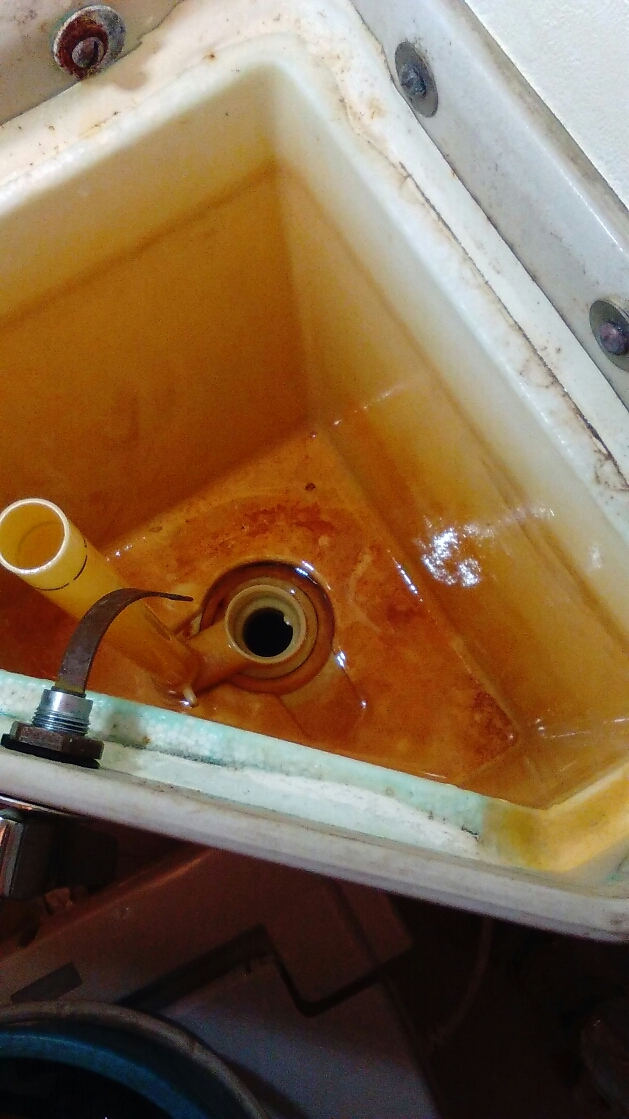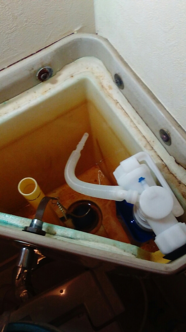 トイレタンク内で水量を調整するボールタップという部品が経年劣化で壊れて水漏れしていました。古いタイプは鉄でできているため錆びやすく壊れます。今のタイプは全てプラスチックで水に