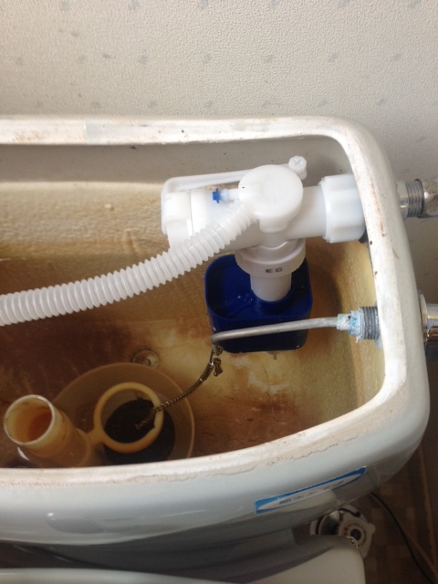 お伺いしてタンク内を見てみると、ボールタップという部品が劣化していて水の止まりが悪い状態でした。