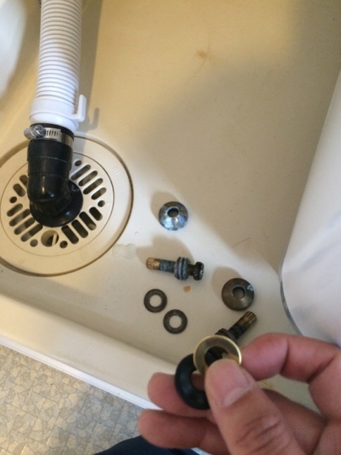 本日は、管理会社様からの依頼で洗濯水栓の水漏れで恵庭市の賃貸アパートにお伺い致しました。早速状況を点検してみると2ハンドル部に湯・水両方からハンドルを開けると水漏れしてくる状況でした。管理会社様に状況と修理内容を報告しご了承後作業致しました。今回は三角パッキンと言う部品を交換し改善致しました。(^^)/