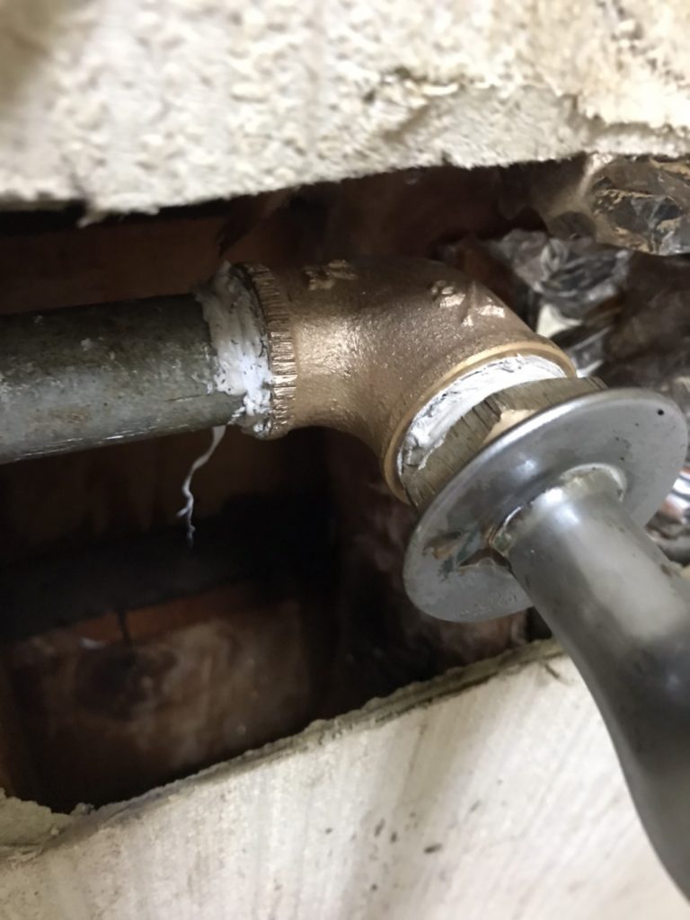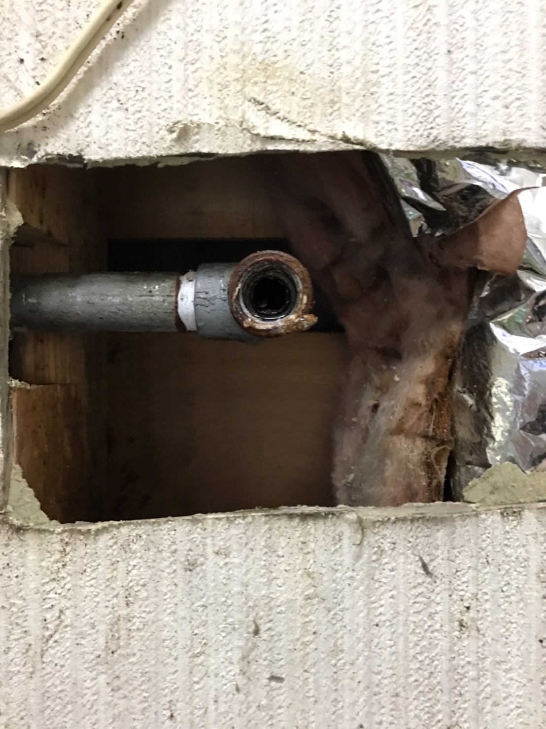 調査をしてみると、壁の中の鉄管が腐食して水漏れしており、それが床に落ちて染み出してきていたようです。