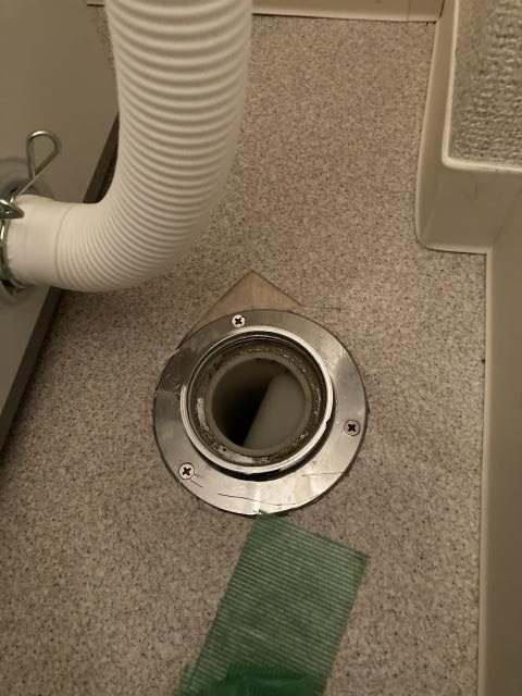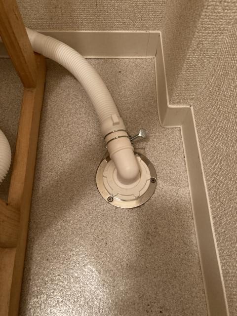 まだ住み始めたばかりの入居者で、洗濯ホースが排水にうまく入らず床に水漏れしてしまうとのことでした。
