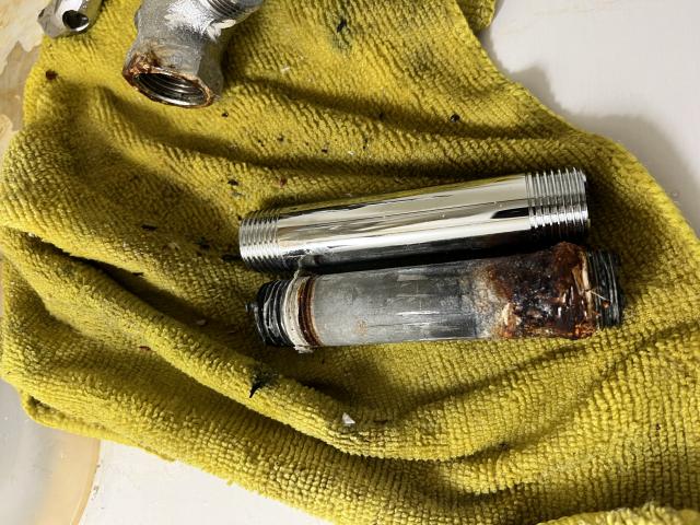 水漏れしている箇所は壁から収納内に伸びている配管で、もうサビにサビて限界を迎えていたようです。