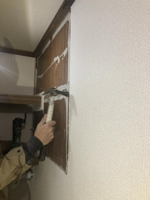 壁の中から水が染み出してきている状態でしたので、壁を開口し管を調査することにしました。