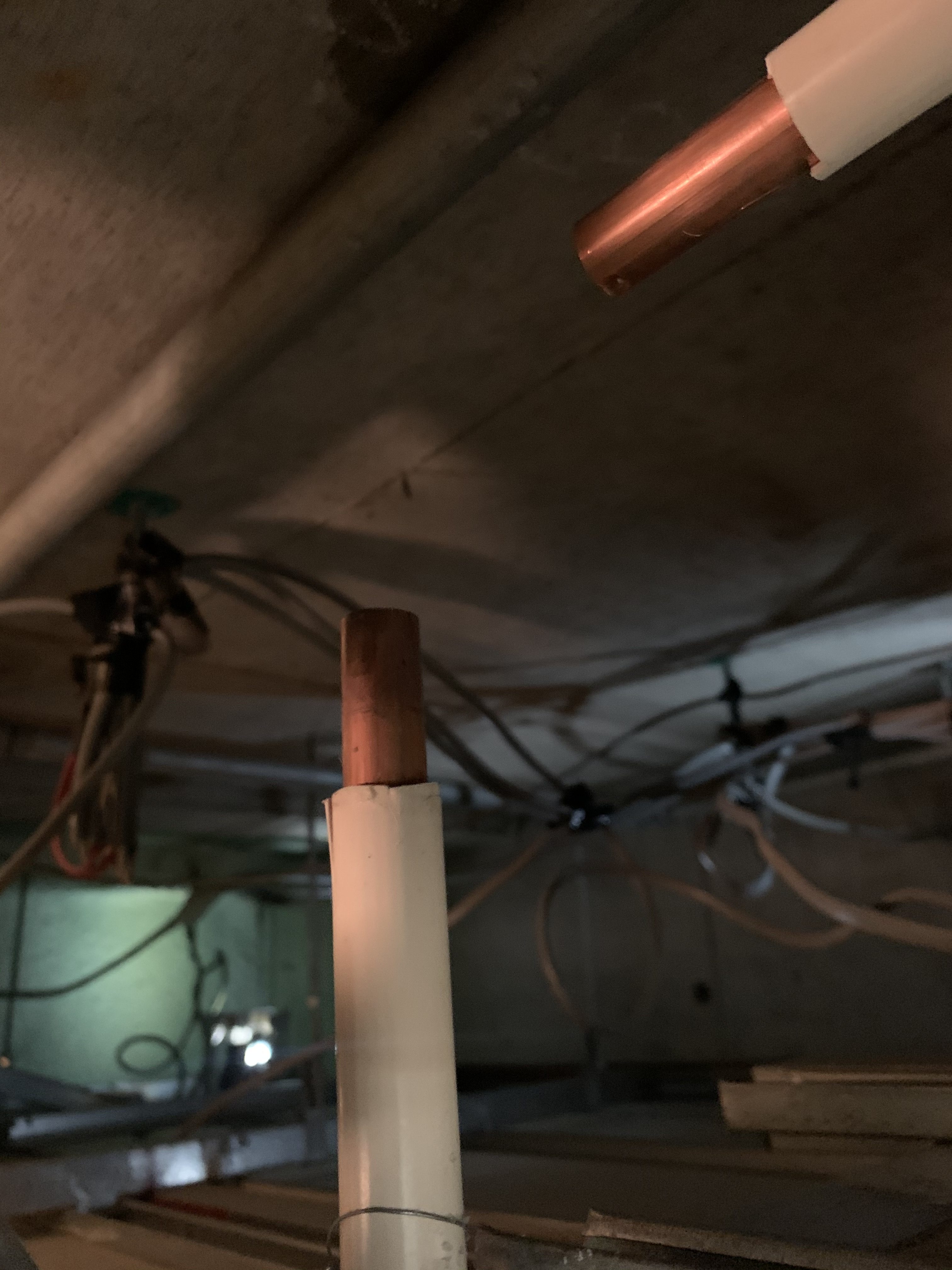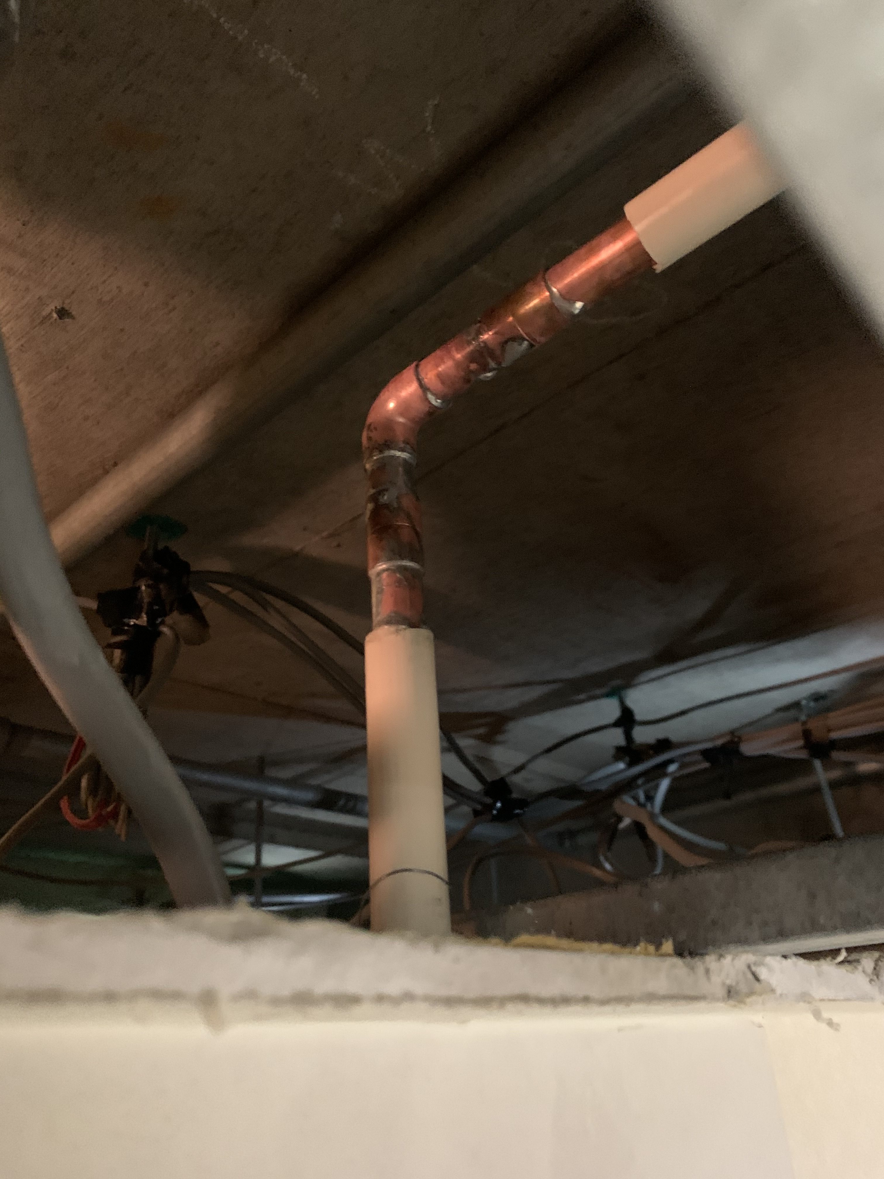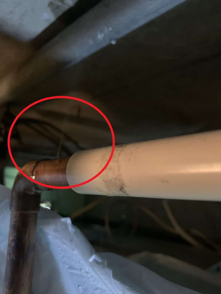 調査してみると、トイレの反対側にある化粧台付近から水が漏れいているのを確認できたので、化粧台の給水管をさらに調査したところ、天井内の給水管がピンホールしていました。すぐに管理会社様へ連絡し、状況と作業内容をお伝えしました。すぐに、修理してほしいとの事で、ピンホールの修理を行いました。