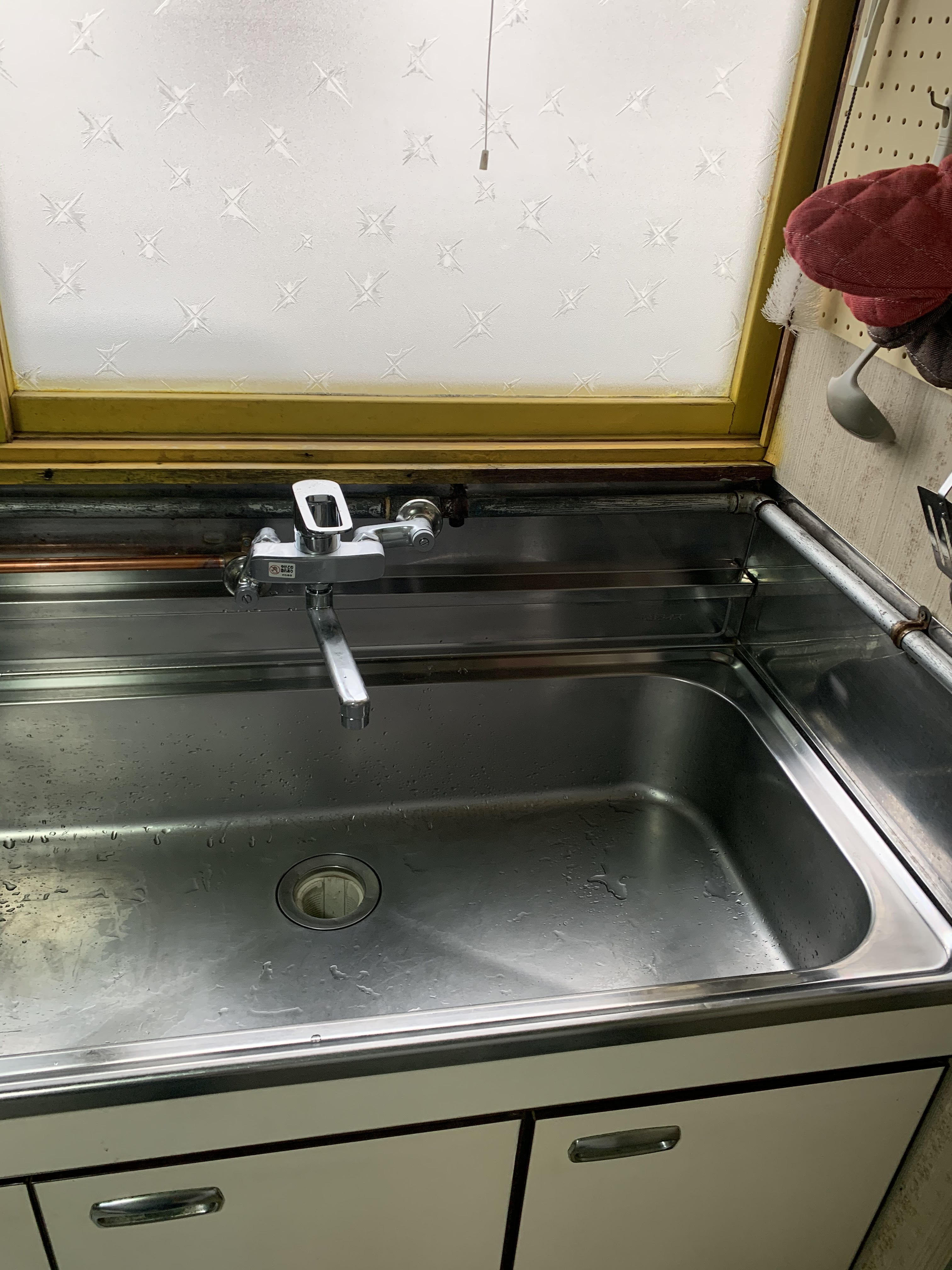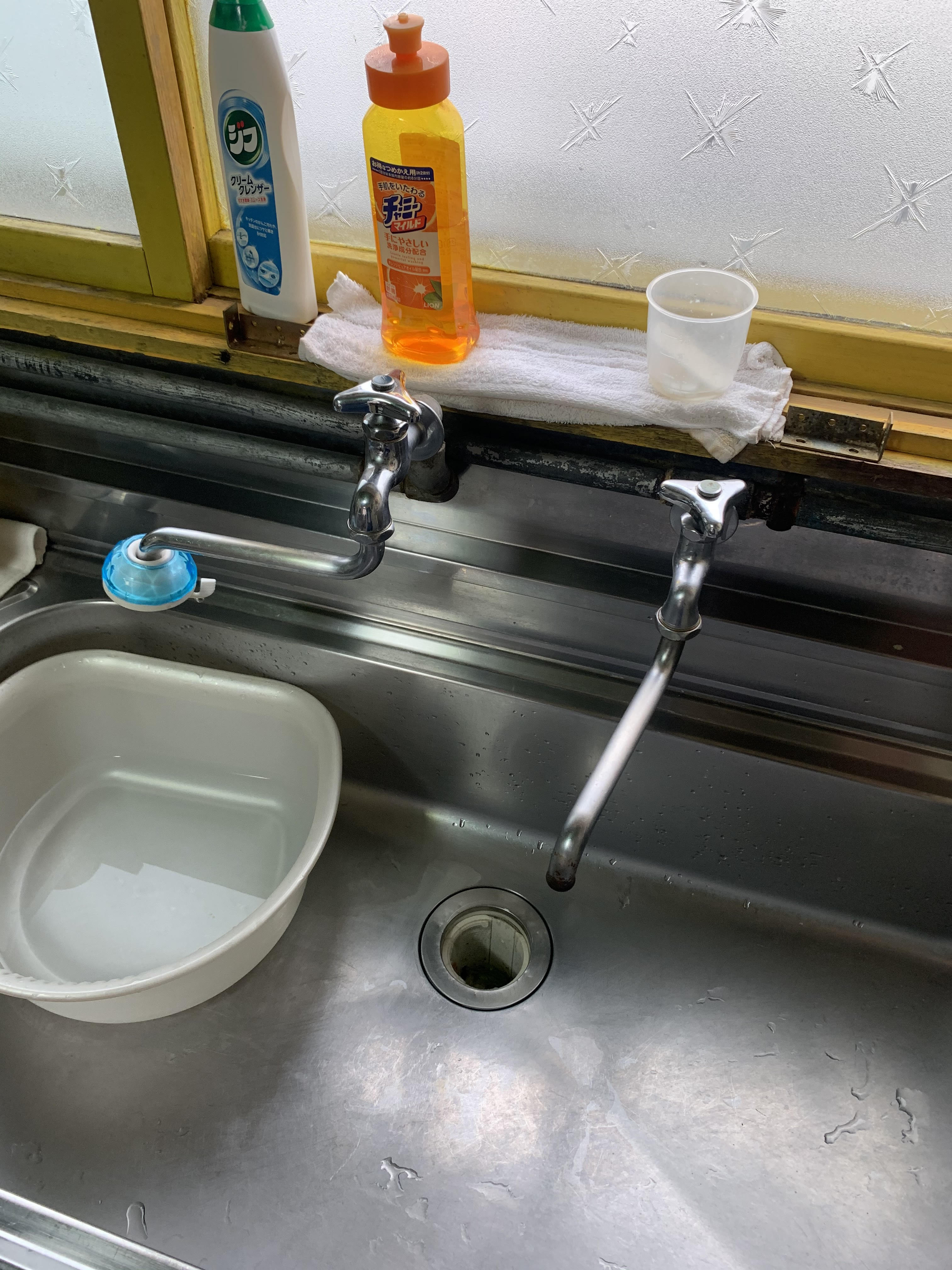 蛇口は昔ながらの単水栓で、水とお湯が分かれて設置されていました。