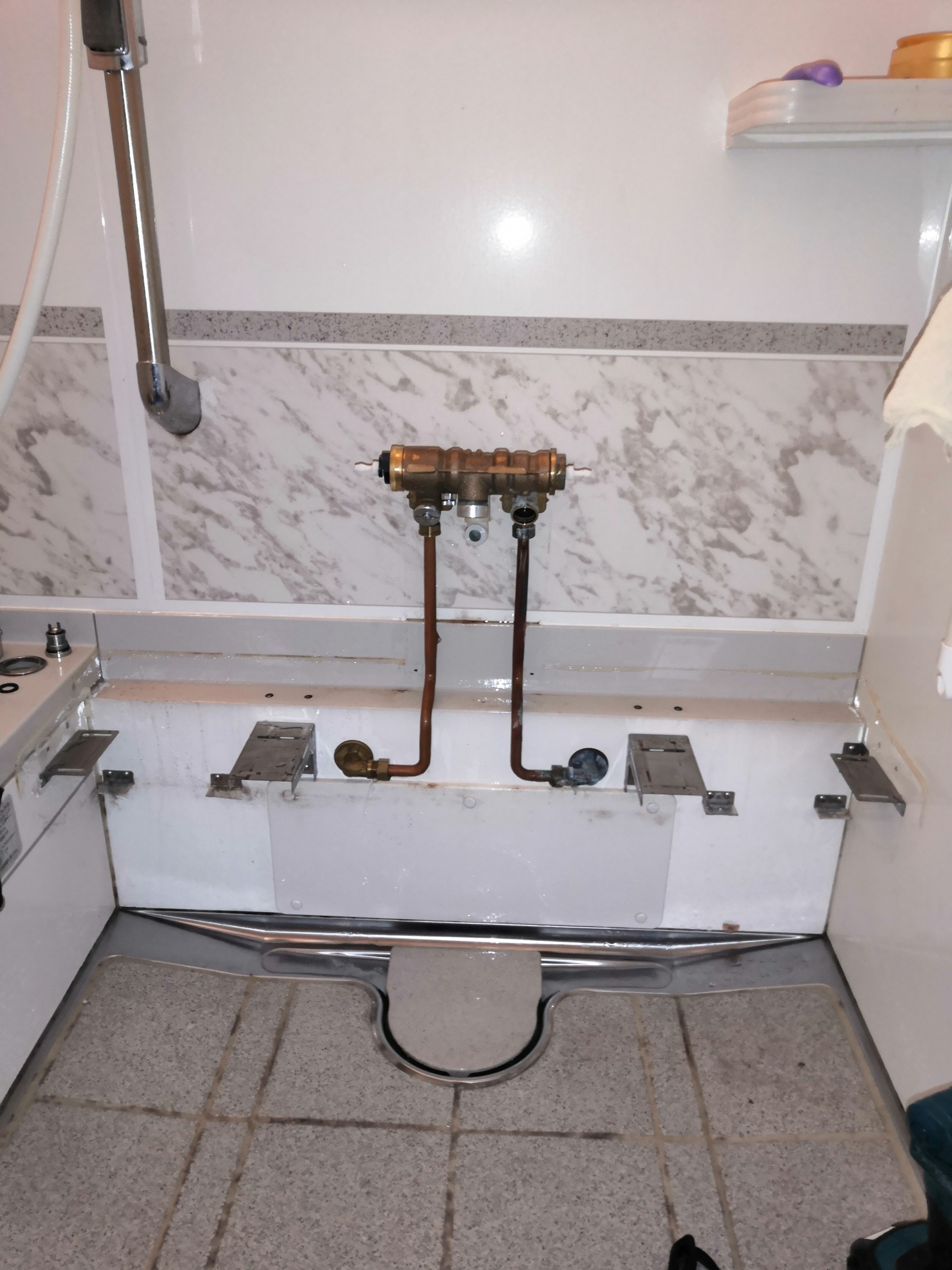 どうにか、カウンターを外して点検してみると予想通り水栓と接続されている銅管がばっくり裂けちゃってます!ユニットバス専用の水栓の配管は純正品の部品を取り付ける必要がありますが取り寄せに時間がかかりますのでお客様に確認をして代替でフレキ管での応急処置とさせていただきました。外すのが大変だったカウンターとコーキングを打ち直して完了です!