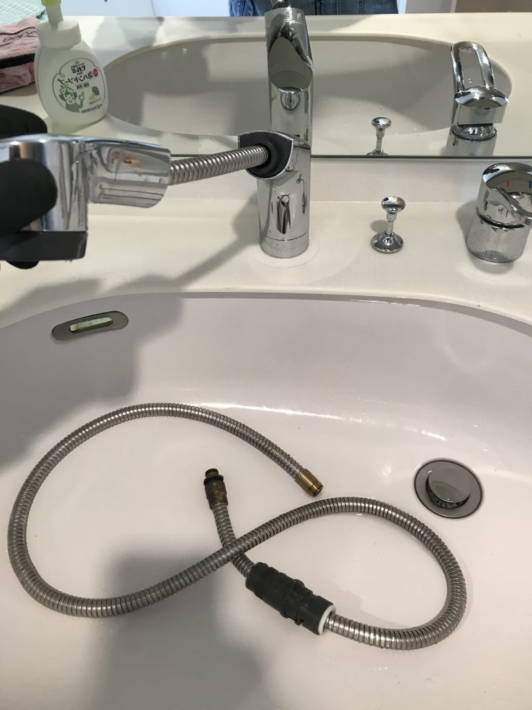 お客様がご使用の洗面水栓はシャワーヘッドを引き出せるタイプで点検してみると、シャワーヘッドと蛇腹ホースの繋ぎ目が劣化したことが原因での水漏れでした。数年前から販売されている洗面化粧台に付いている水栓は、ほとんどがこのタイプで、部品の名称はメタルホースと言うのですがトラブルが非常に多いい部品になります。