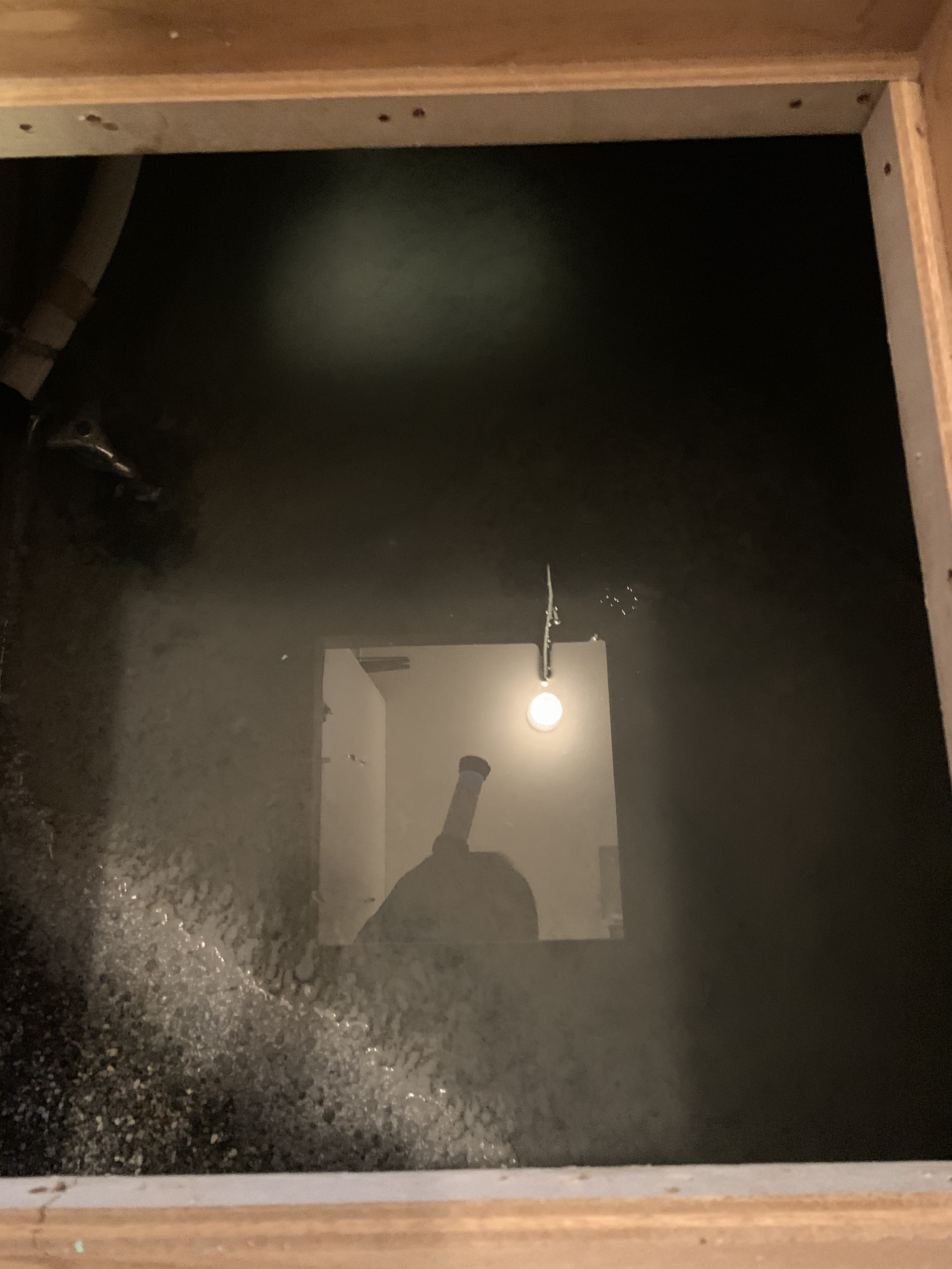 見た目は問題ないのですが確かに、お客様の言う通りで洗濯置き場洗周辺が異常に臭いです。床下の排水管が怪しいため洗濯置き場にある床下点検口を開けて点検してみると…床下に水溜まりが(゚Д゚゚゚;))