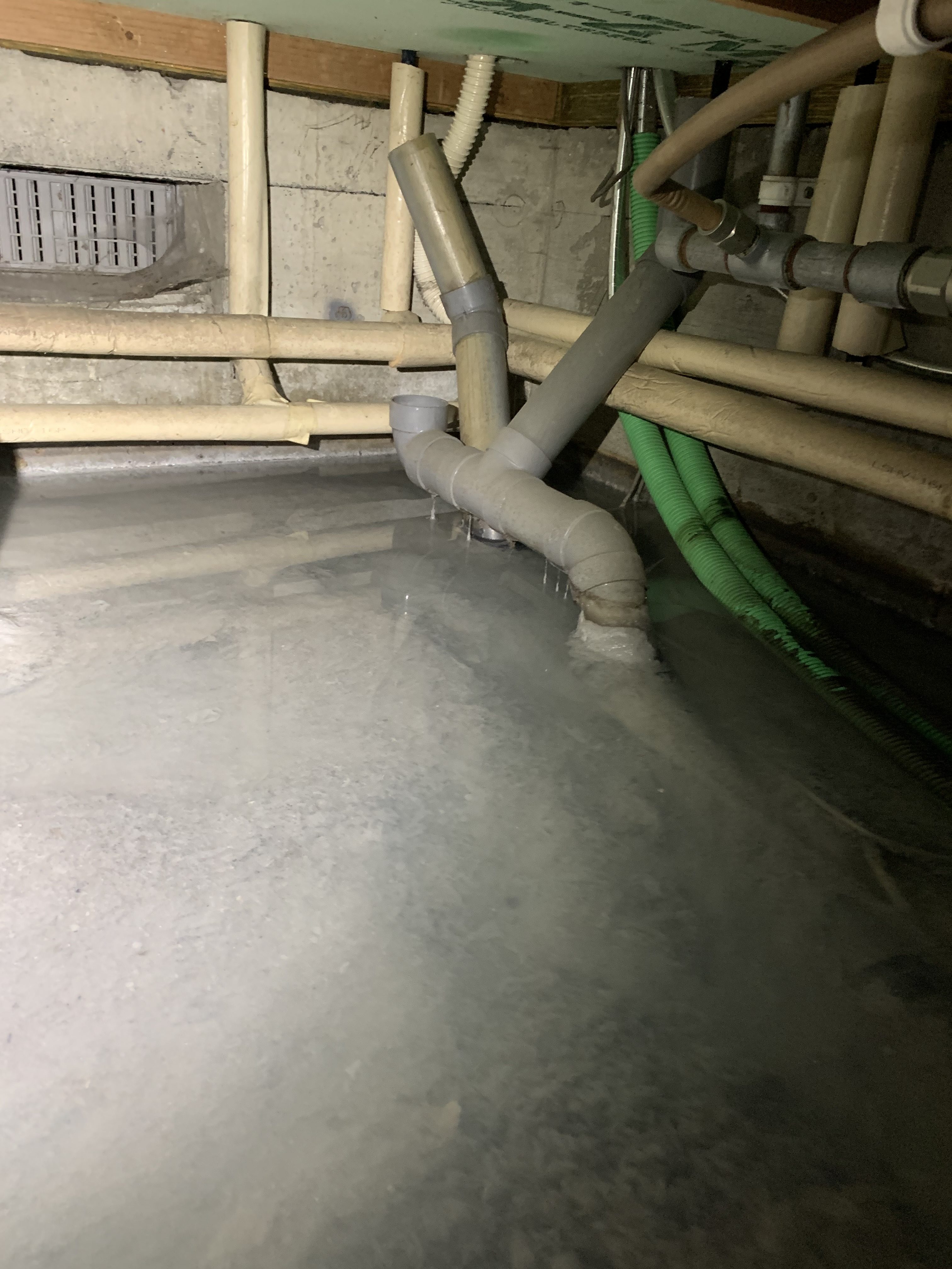 取り敢えず床下に溜まった排水をバケツで地道に汲み上げて、床下に潜り作業開始!…といきたいところですが2年間垂れ流した排水がヘドロ状になり悪臭を放ってます。悪臭と狭さの中で心が折れそうになりましたが、洗濯が出来ないお客様の事を思えばなんのその!無事に排水管を新しい物に作り直して完了しました。