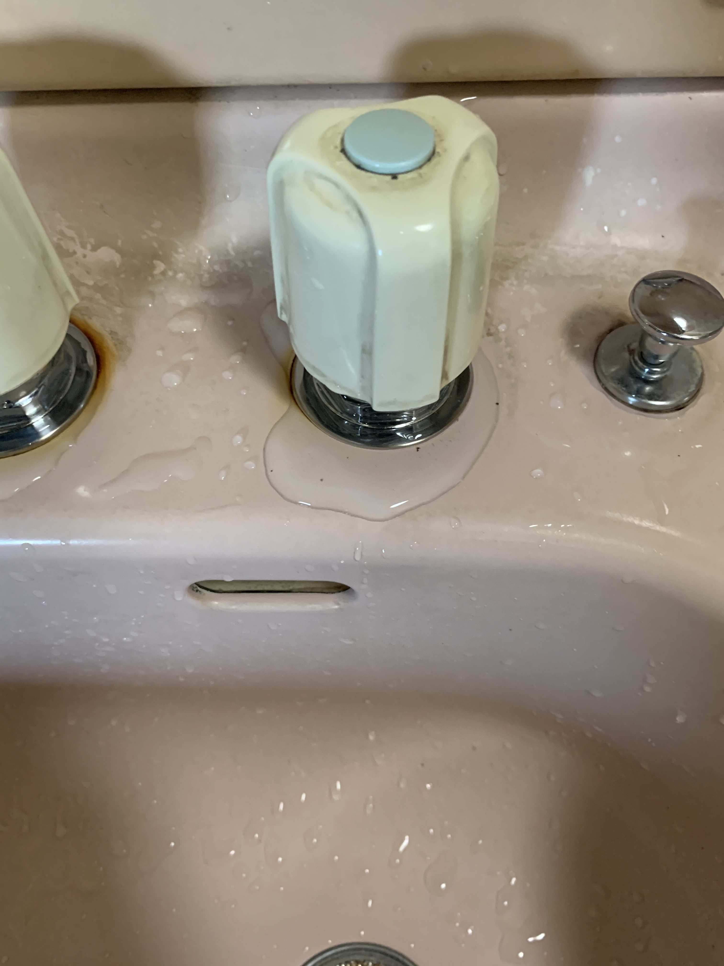 お伺いしてみると、大変古いタイプの洗面化粧台に付いている水栓で、ハンドルをひねると根元から水漏れしています。
