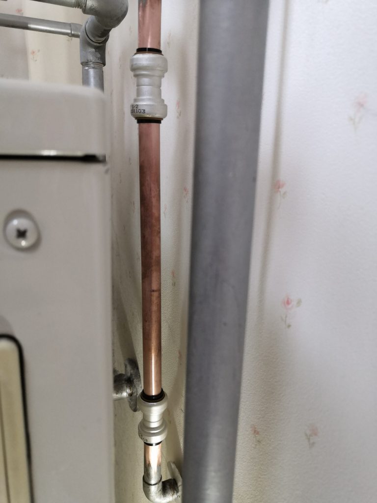 ボイラーと壁の間に配管があって、溶接作業が困難と危険なので、溶接作業がいらない部材を使用し修理しました( `ー´)ノ