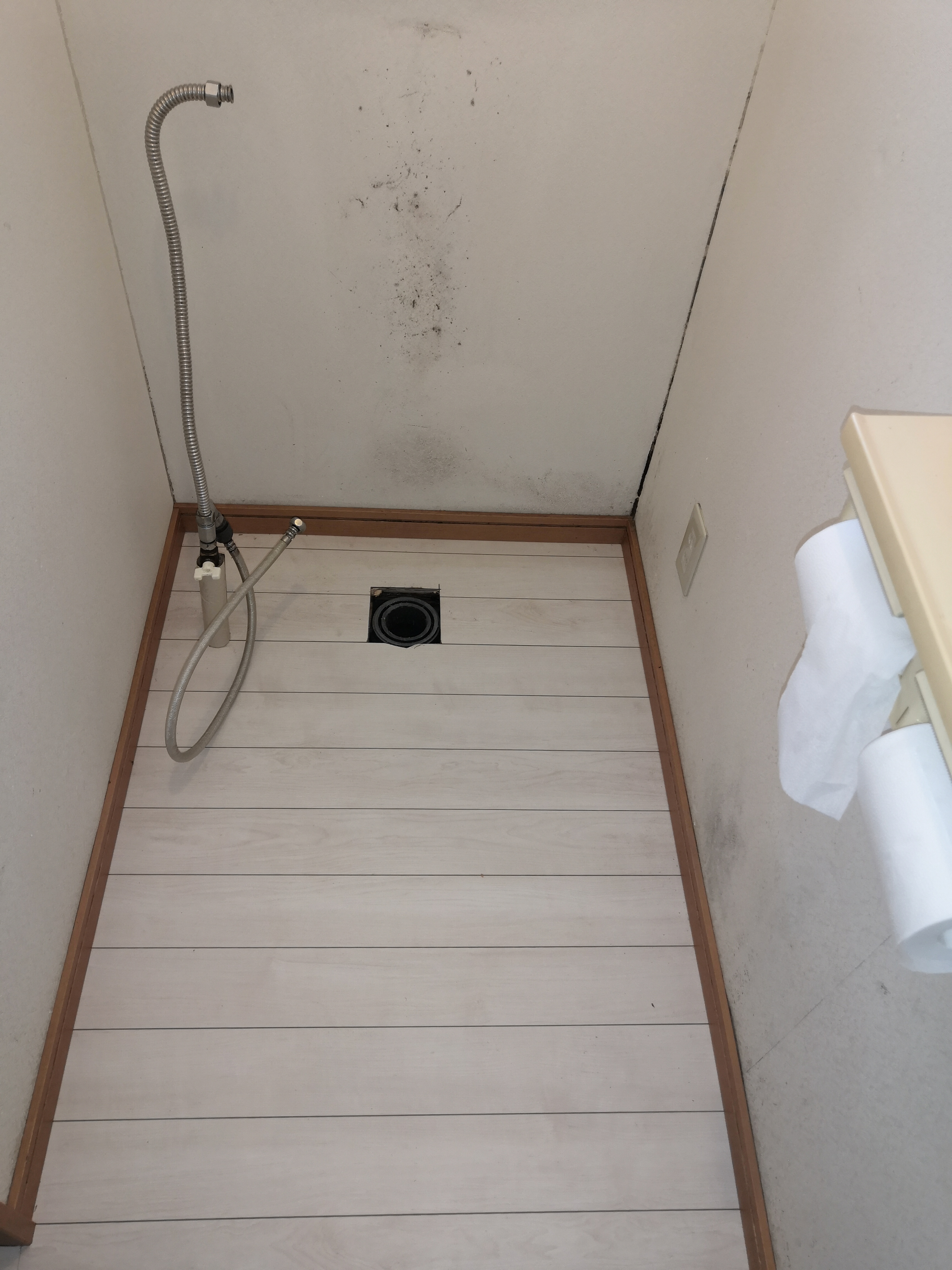 左側の床に水が溜まっており、調査してみるとウォッシュレットから水が漏れていると判明し、お客様へ報告しました( `ー´)ノ