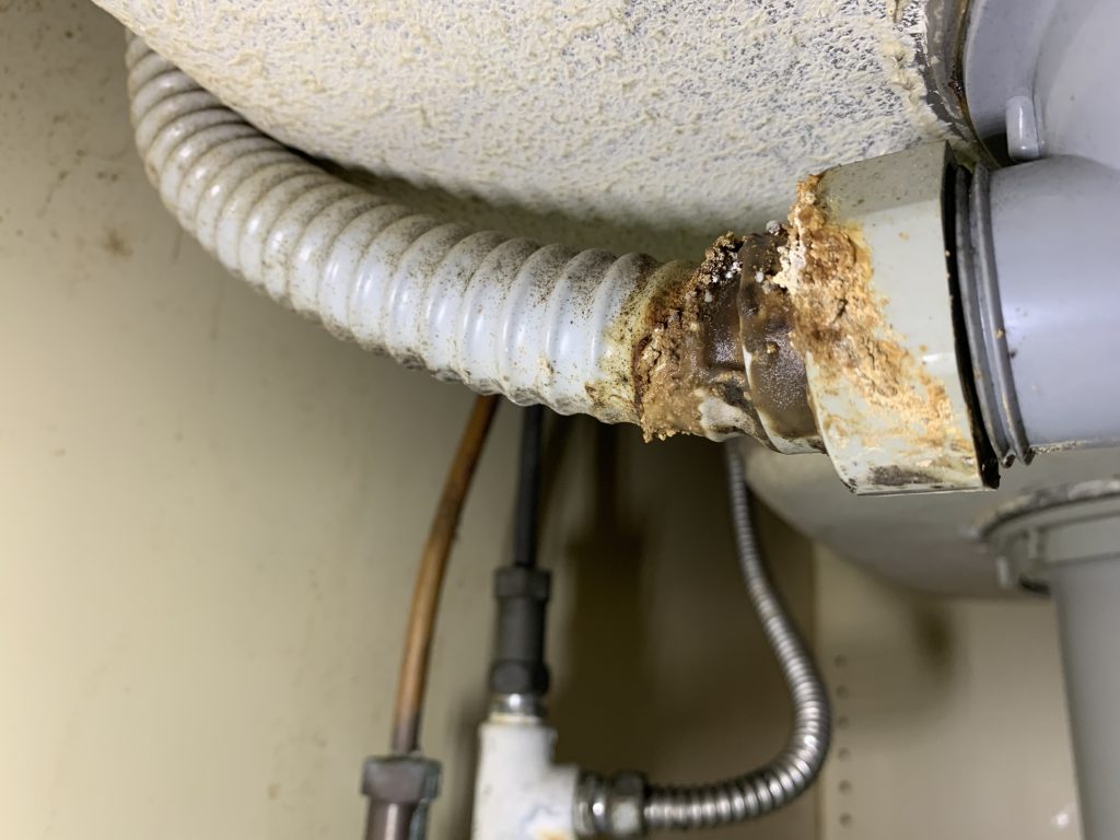 本日は、キッチンの排水から水漏れするとのご依頼があり、出動しました。お伺いし点検してみると、シンク下に付いているトラップに繋がるドレン用排水ホースの繋ぎ目から水漏れしています。ドレン用排水ホースとは、シンクに水を溜める際に溢れるのを防止するために、シンクの上部に付いている排水口に繋がるホースのことで、最終的にシンク下の排水トラップに合流します。今回は排水トラップ側の繋ぎ目の部分の劣化で、水漏れが起こったようです。