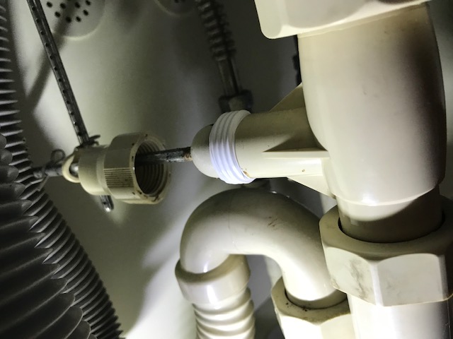 調査をしてみると、水漏れ箇所は洗面の排水栓という部品とポップアップ棒の繋がっているナットの部分でした。