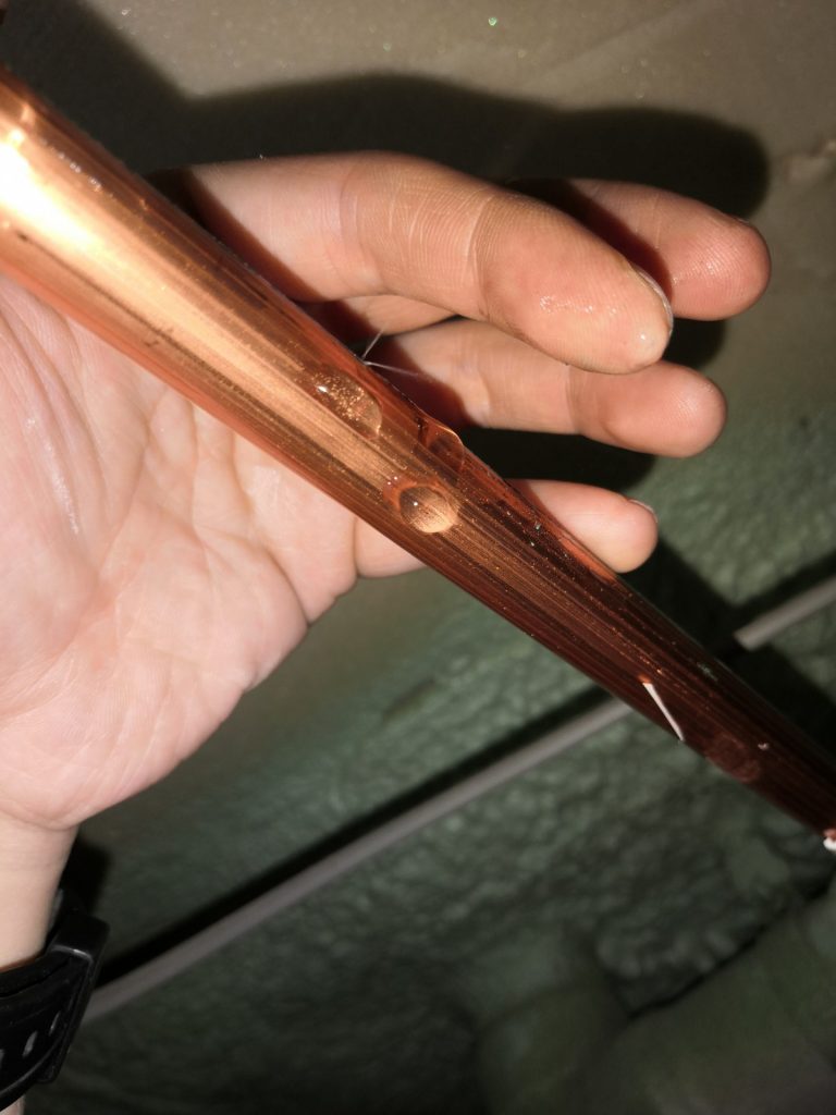 漏れの原因は、銅管配管の経年劣化によるピンホールです。