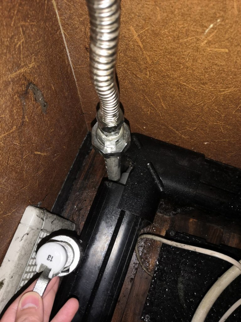水が漏れている配管を調査開始( `ー´)ノ 配管の種類はフレキ管というものが使用されており、そのナット部分から水が漏れて来ていました( ノД`)