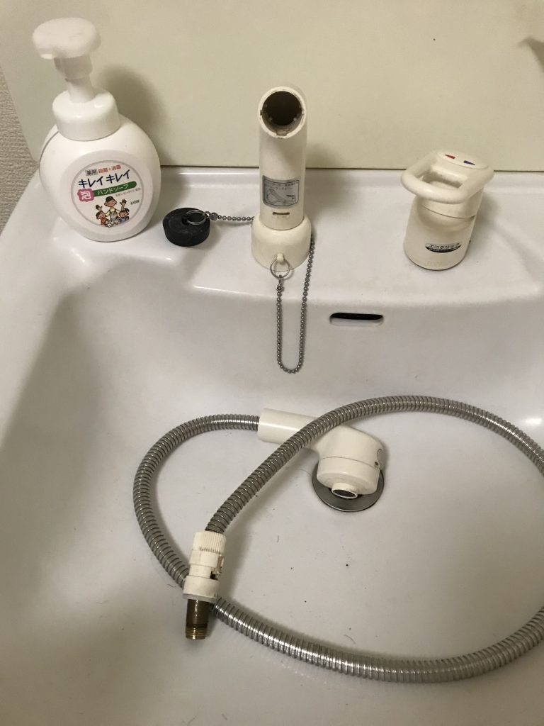 調査したところ、シャワーヘッドが伸縮する為のホースから「ポタポタ」と水が漏れておりこれが原因だと判明しました。洗面化粧台と水栓はまだ使用出来るので、ホースのみの交換で見積もりを作成しご提案させていただきました。