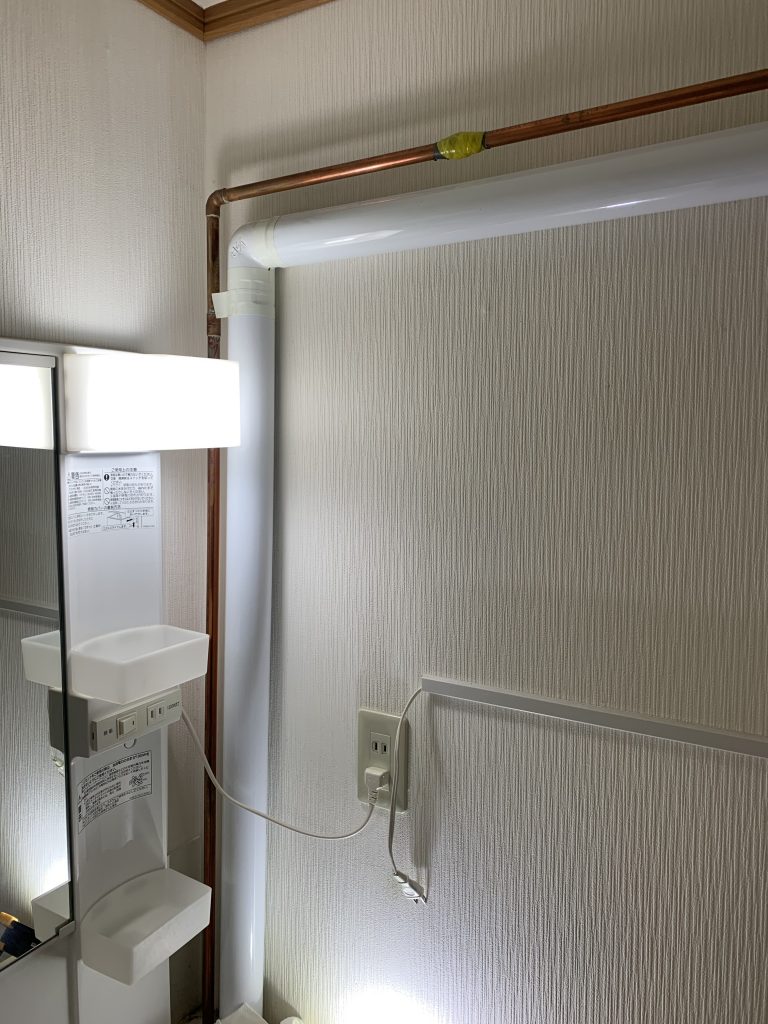 点検してみると、洗面化粧台の右側にある給湯管から「シュー」っと音がしてます。配管に保温材が巻いてあり漏水箇所がわかないため保温材を外してみると、配管がピンホールして水が漏れています。配管の素材は銅管で旭川ではよくある水質によるピンホールと思われます。