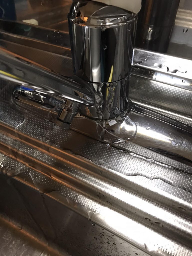 台所蛇口を見ると本体内部から水が噴き出しており、どうやら冬季間の凍結で蛇口が破裂してしまったようです。