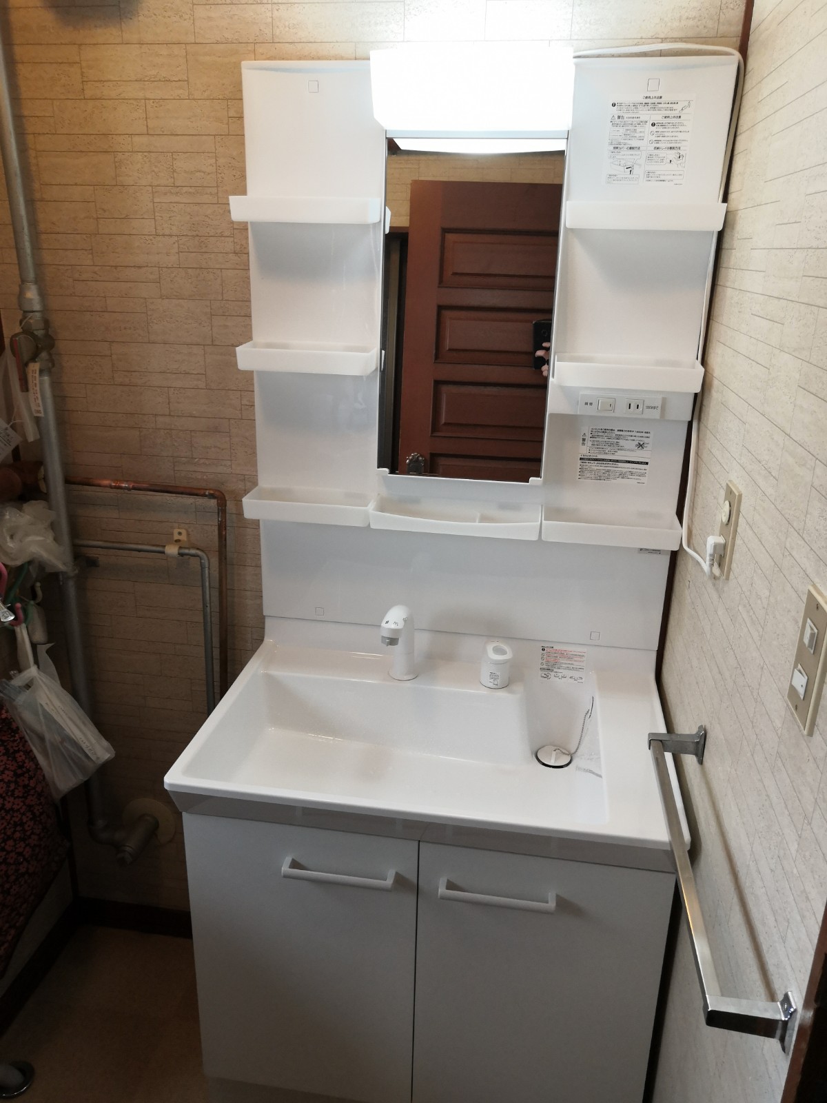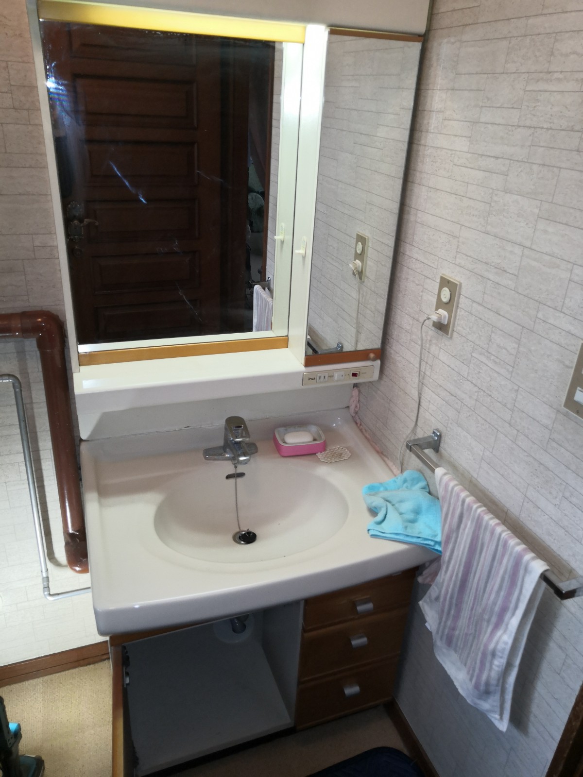 化粧台は20年上使用していたみたいで、かなり古いので本体交換して欲しいと依頼いただき、即日に交換作業開始♪