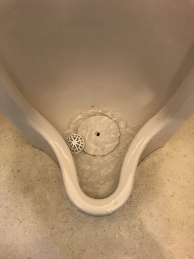 とある会社様の男子用トイレの小便器が詰まったとのこと。小便器の詰まりのほとんどが尿石の詰まりで解消方法は様々ありますが、まずは専用の除去剤での洗浄が安価で手軽に出来る作業になります。