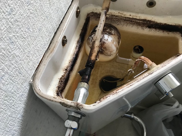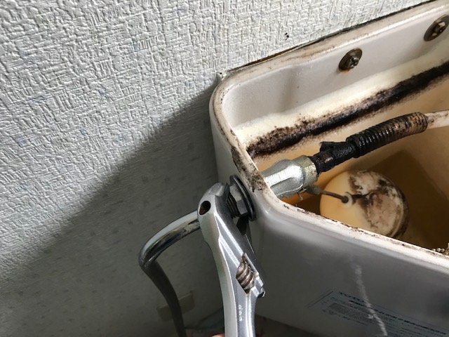 タンク内を見てみると、ボールタップが斜めに取り付けられており、水の噴射が上向きになっていました。