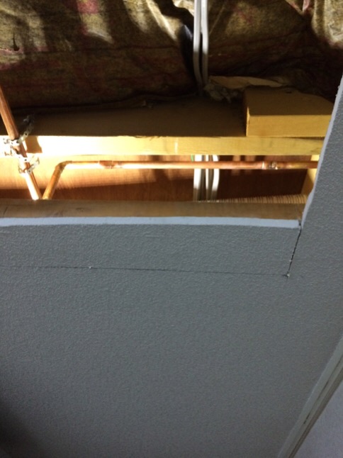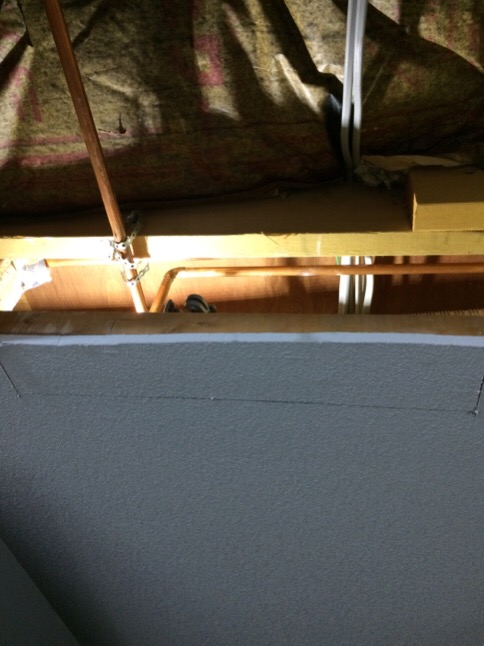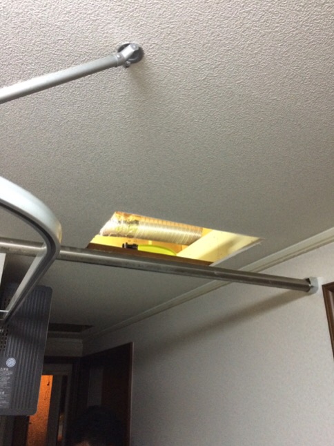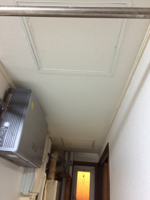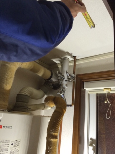 本日は、ボイラー周辺の、水道管から水漏れしていると、お電話頂きました。早速、訪問し点検すると、ボイラーからの給湯管からの水漏れでしたが、いろいろ調査すると給湯管が天井に入っていってるの感じで、天井裏で漏れている様子です。|д゚) 漏れの場所を特定するのに、天井裏を見たいのですが点検口もありません。天井を開口する必要がありますので、お客様に説明し開口することになりました。立ち上がり管の、すぐ上で漏れていればいいのですが・・・早速開口!開けてみると保温カバーをしているので、そこを切り見てみたのですが、この周辺でわなく、もっと先です。”(-“”-)”