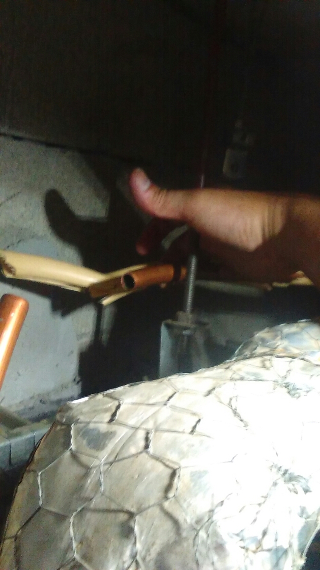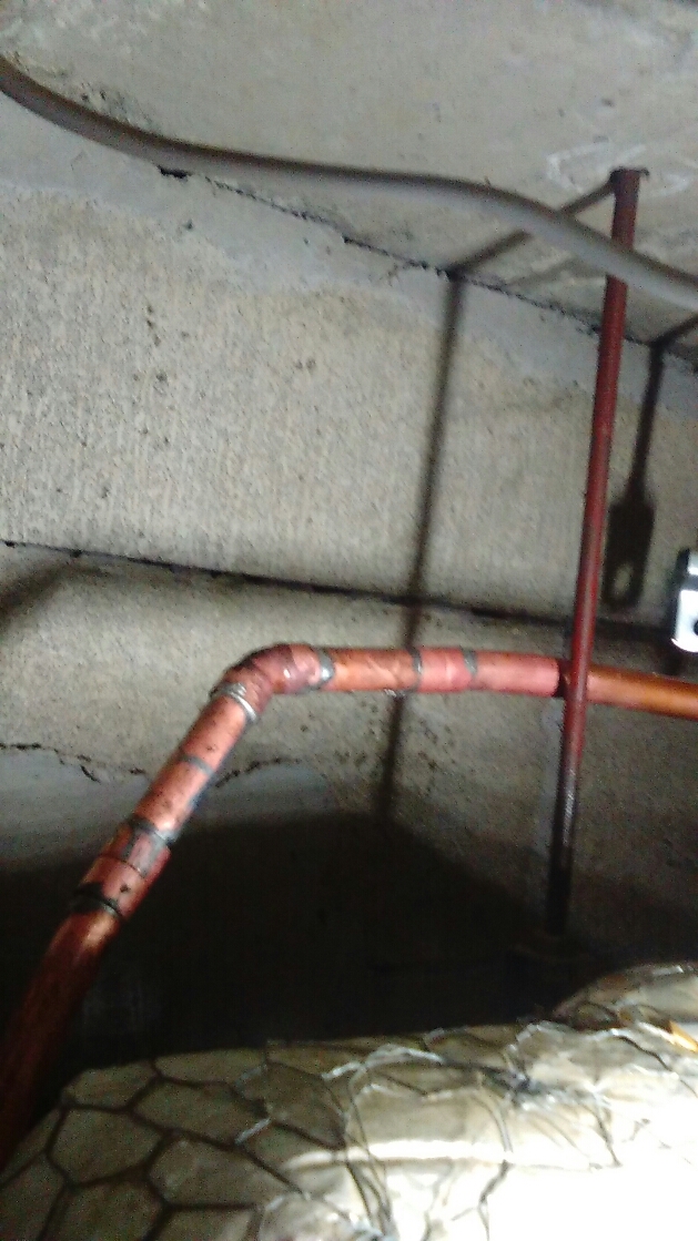 本日は提携先の管理会社よりボイラー配管から水が漏れているので見て欲しいとの事で行ってきました。点検するとボイラーから室内に行く、お湯側の銅管から水が漏れています。室内で見える配管からは水漏れが確認できず、天井の点検口を開け管の被服を剥がしていくと発見しました!銅管のピンホールです。針の先ほどの穴から水がもれていました。そこを切ってはんだで補修して水漏れ改善です。