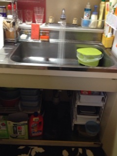 キッチン下の扉を開けると、鍋やらフライパンが濡れていることで水漏れが発覚したようです。