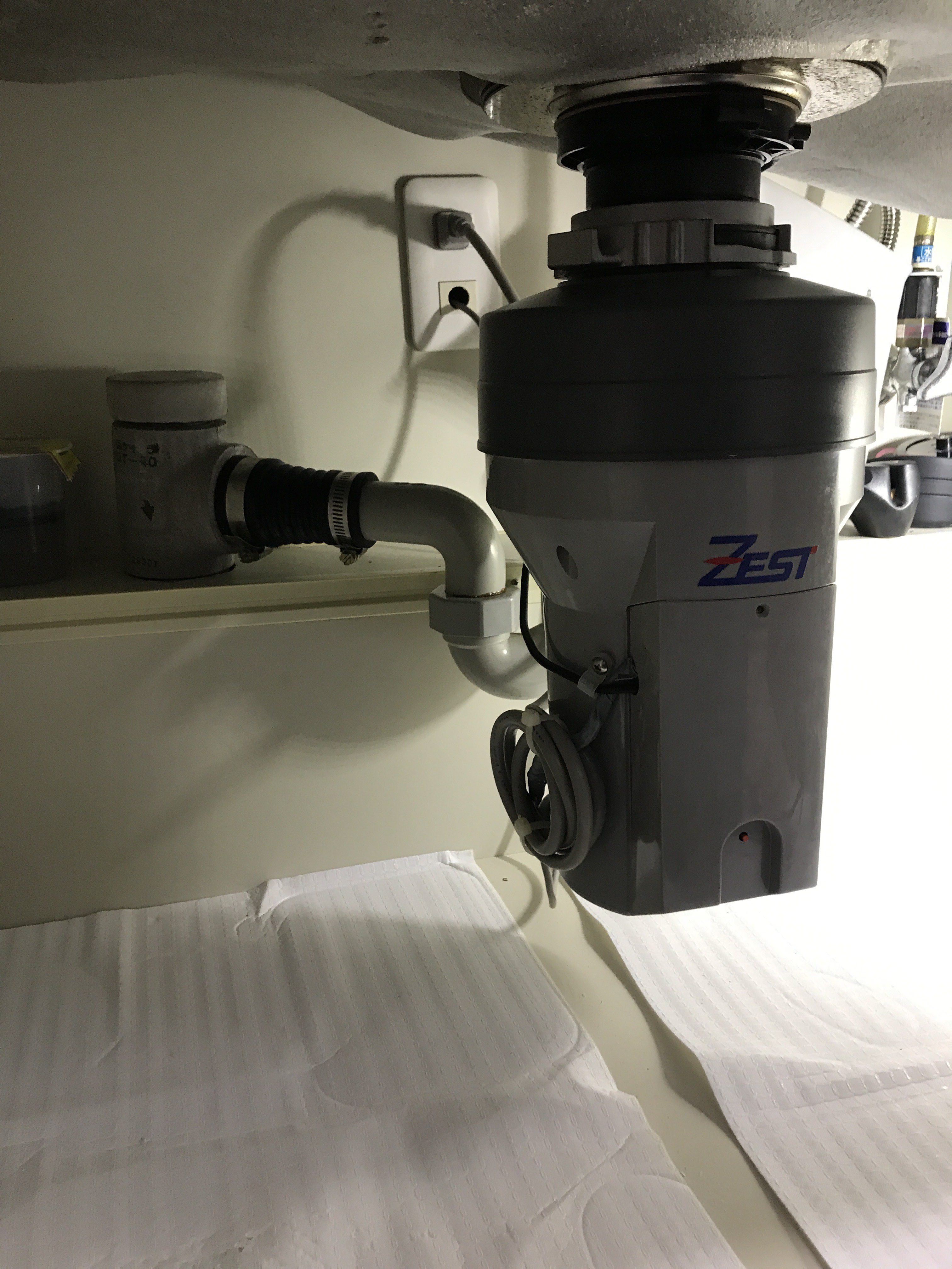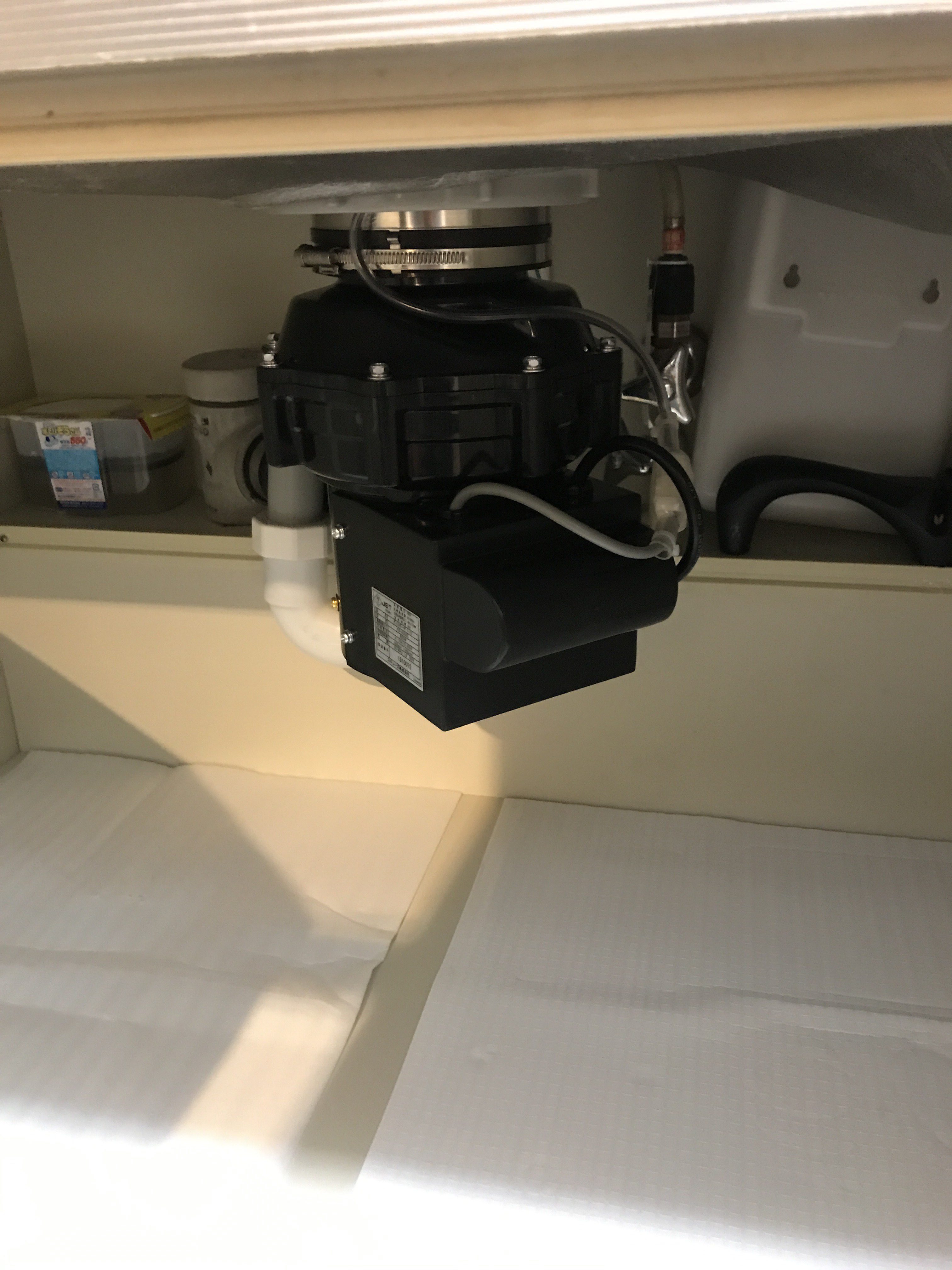 本日は、ディスポーザーが全く動かないとの修理依頼があり出動しました。メーカーは良く設置されているゼスト製でスイッチを押してもピクリともいいません。リセット機能が付いているためボタンを押しますが、再起動しません。導通テストでリモコンや配線は問題ないため本体の基盤が故障しているようです。ディスポーザーの寿命は7年から8年くらいですが、こちらのお客様は12年ほど使用しているということで、本体交換をご提案しました。ディスポーザーの修理対応の場合、修理はもちろんのこと、その場で交換まで至る場合もあるため車両に常時在庫していますので、今回のお客様も即日で本体交換をさせて頂きました。