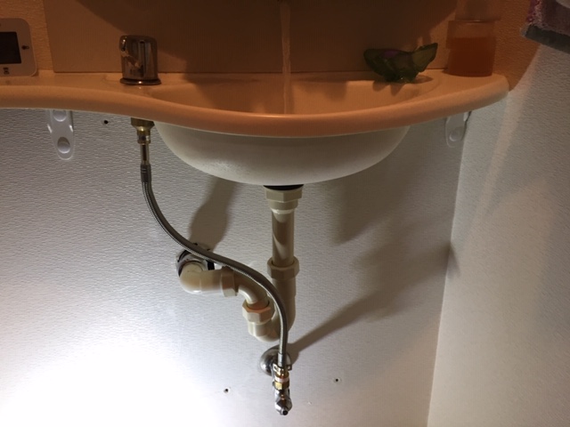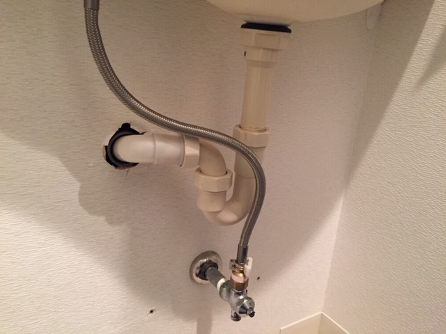 壁の中からツラになっている排水管が見え、そこに手洗いのトラップ排水が伸びていました。