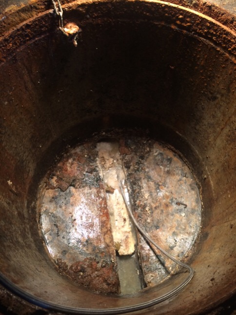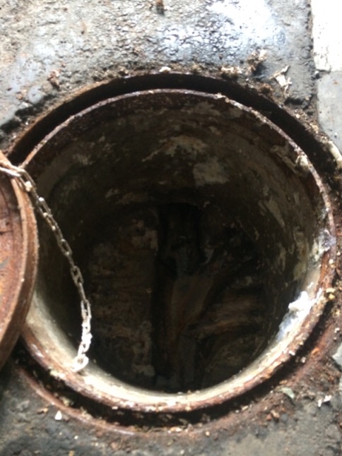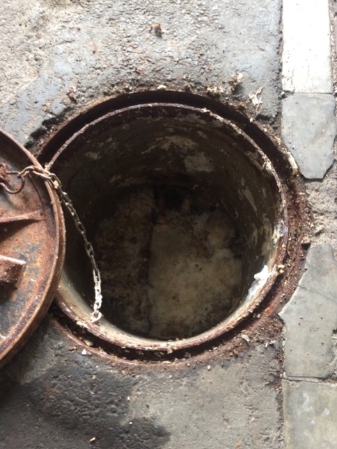 いろいろ調査してみると、外のマンホールに水がタプタプに溜まっていて、汚れがひどい状態でした。