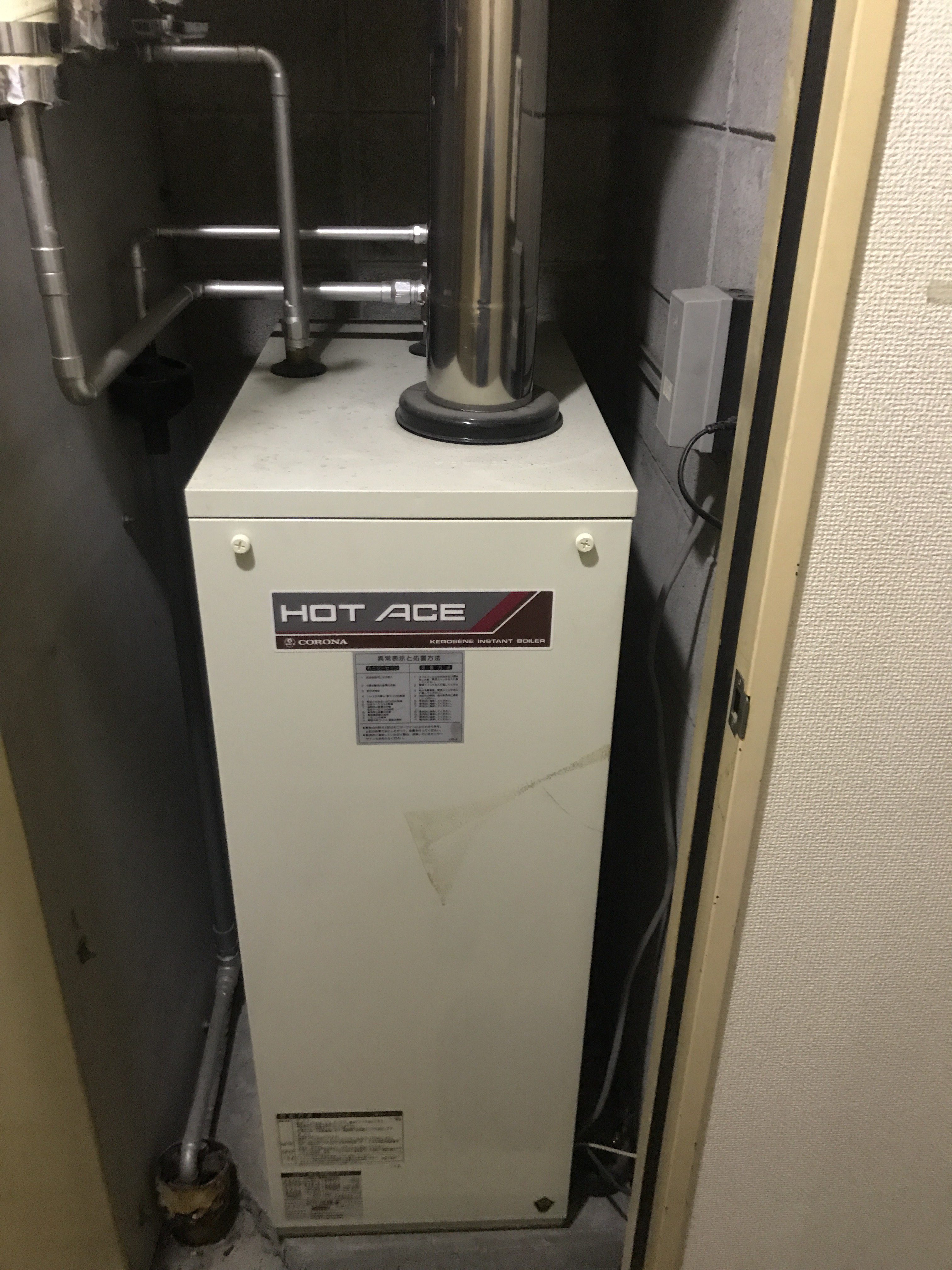 本日は、以前に石油ボイラーの点検にお伺いしたお客様宅へボイラーの交換にお伺いしました。以前ご使用のボイラーは20年以上ご使用のコロナ製のボイラーで故障内容はエラー3の表示で空焚き検知の作動です。メーカーに確認したところ部品の供給はないため修理は不可能との事でしたので本体の交換になりました。貯湯式のボイラーを交換する場合は、まず古いボイラーに貯水されている水を抜く必要があるのですが、ボイラー横にある排水口が錆びで詰まってしまって排水されないため満水の状態で、どうにかボイラーを外して交換をしました。ボイラーが古いと、それに付随する設備も自ずと古いため、色々と手間がかかり大変な現場でした( ;´Д`)