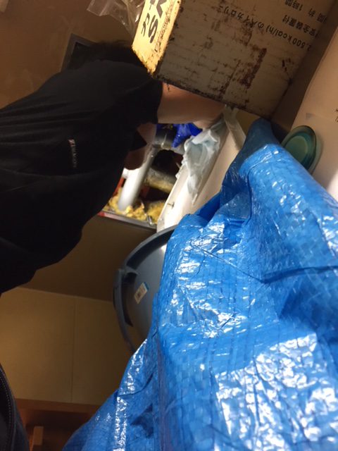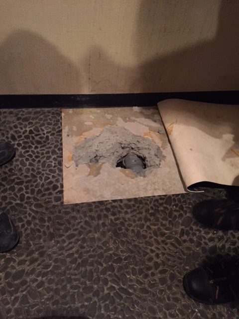 排水経路を予測し、二階の客席の下から床を開口し、一階と二階に分かれて作業を行いました。